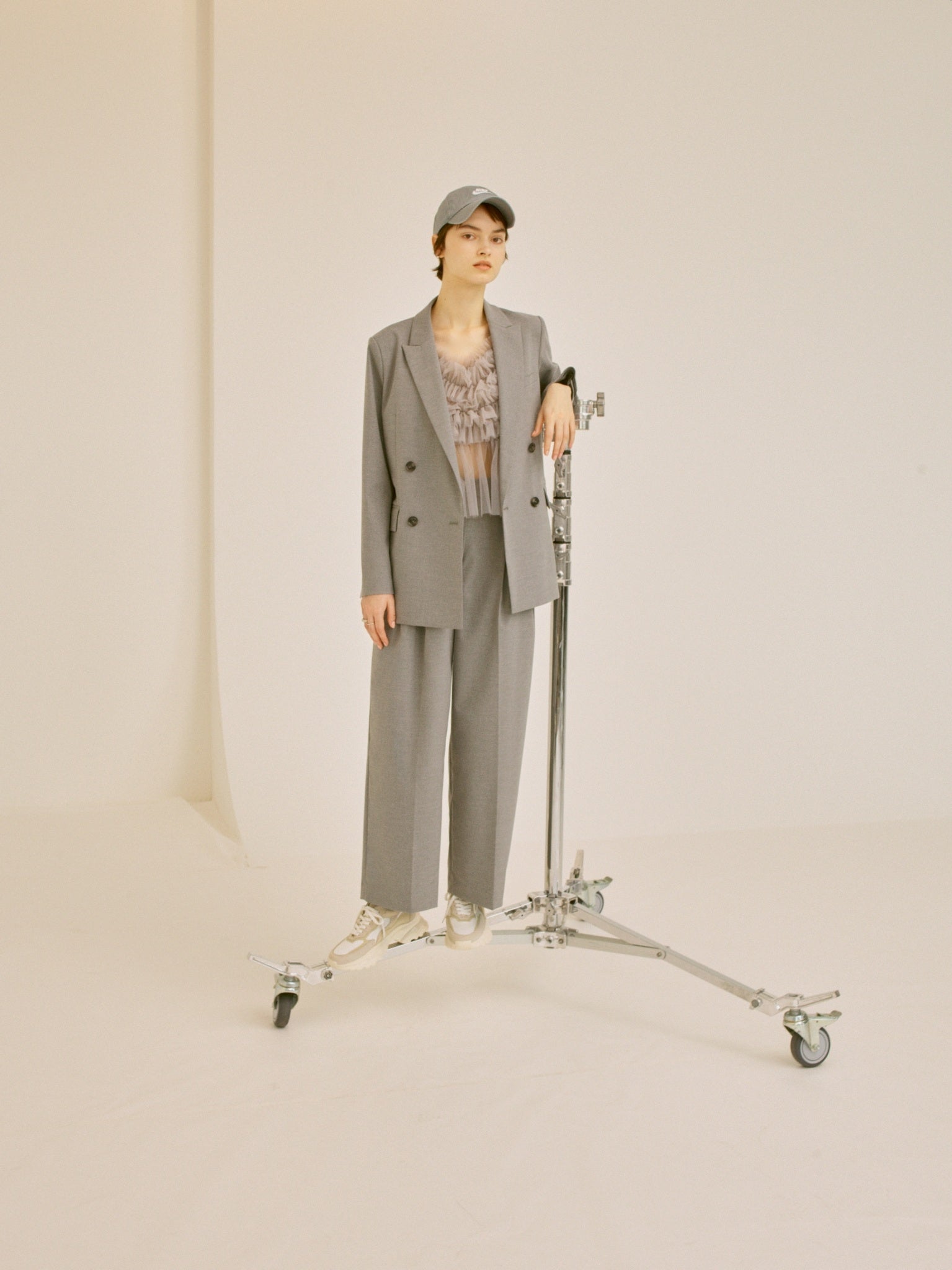 品のあるテーラードアイテムにスウェットやフリルを合わせた新鮮なスタイル。