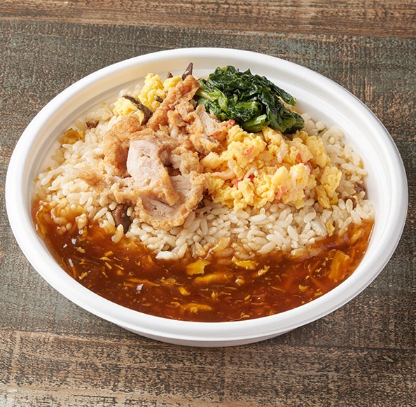 【内容】「マルシン飯店」の天津飯のあんを参考にし、あんの中にたまごを入れました。炒飯に食べやすくカットしたから揚げ、カニカマたまご、きくらげたまご、青菜炒めを乗せたボリュームたっぷりのお弁当です。あんとおかずを絡めながら食べることで味の変化を楽しむことができます。
