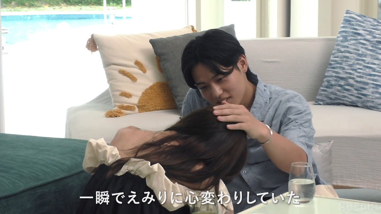 今夜放送の第5話では、男子メンバーが気になる女性を指名してデートを行うことに。唯一誘われなかったえみりが、デートから戻ってきたまさおと2人きりで言葉を交わすことになります。「1人で残されて残酷だよね…」と切り出したえみりは、「絶対後悔するなと思って、最後まで(まさおと)向き合いたい」とまっすぐな想いを伝えます。これに対して、まさおは「全く気持ちがないかと言われたらゼロとは言い切れない」「俺に気持ちがあるならそのままでいてほしい」と話し、2人の距離は一気に近づいていきます。さらに、2ショットルームではハニーカードで指令された「心が惹かれたポイントをお互いの耳元でささやく」ミッションに挑戦することに。ただならぬ距離感を見せるえみりとまさお。思わず「チューするかと思った」と声が上がるほどの接近に、MC陣も大興奮の様子です。しかしその直後、まさおと距離を縮めていたうららが、かいりとともに帰宅。まさおはどこか落ち着かない様子を見せ、スタジオでは「完全に浮気現場見られたみたいじゃない?」「修羅場やん!」と絶叫します。