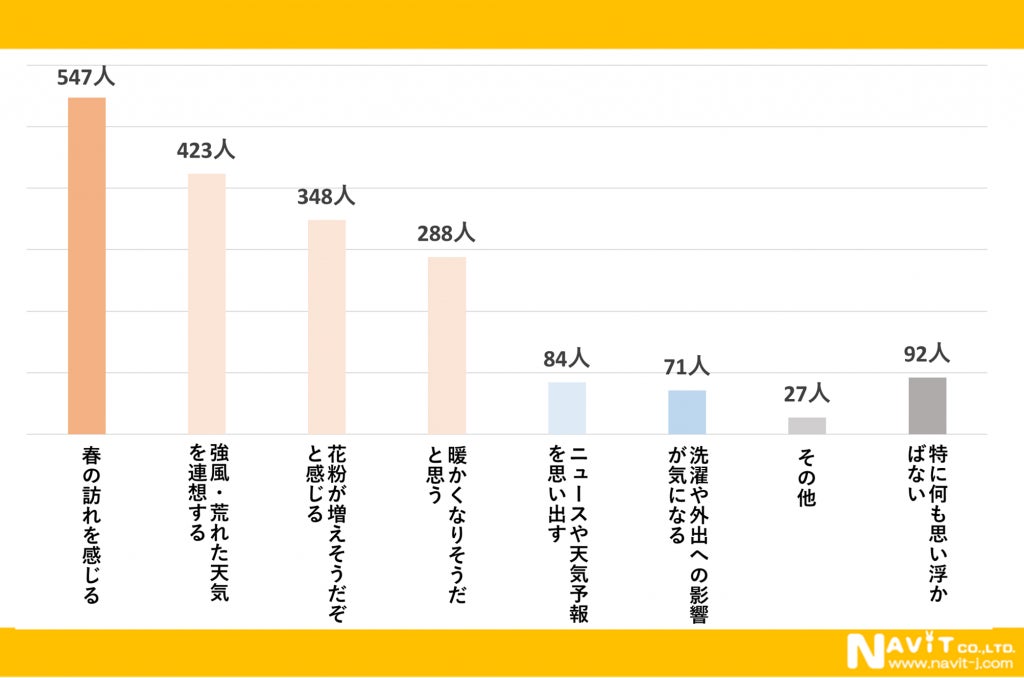 春一番が吹くと思い浮かぶことはありますか?というアンケートを複数回答にて実施したところ、「春の訪れを感じる」と回答した方が547人、「強風・荒れた天気を連想する」と回答した方が423人でした。また「花粉が増えそうだと感じる」と回答した方も348人いらっしゃいました。