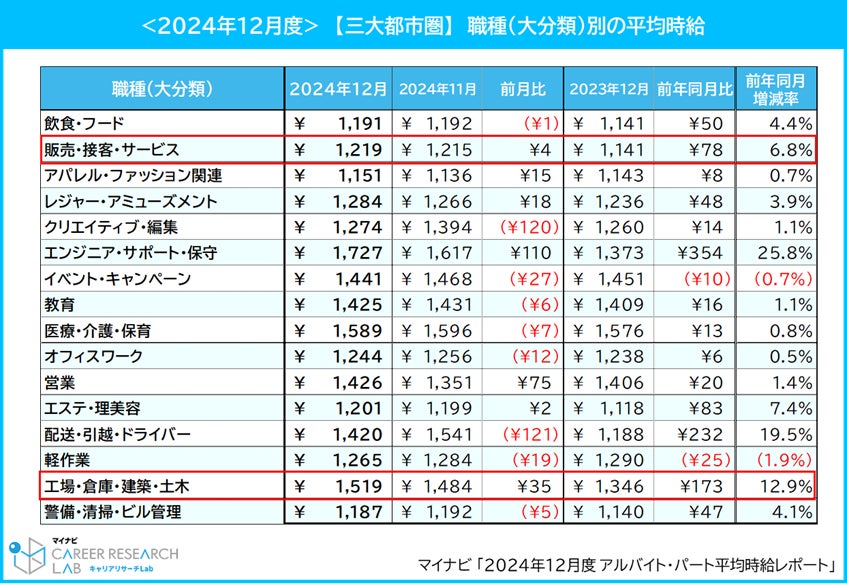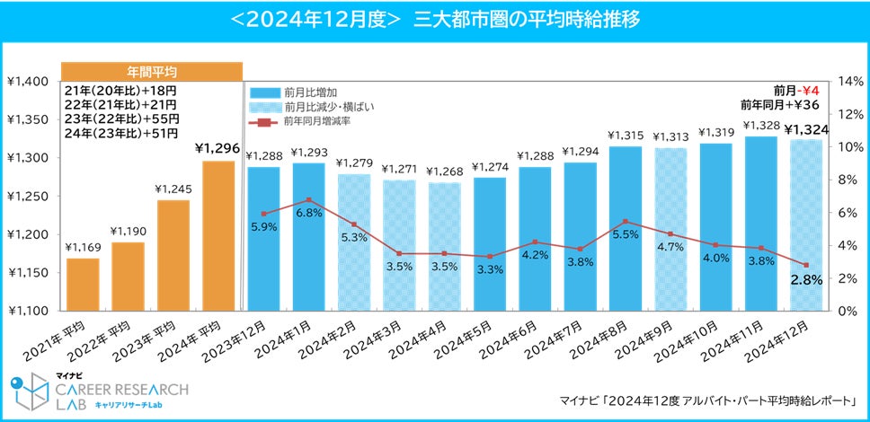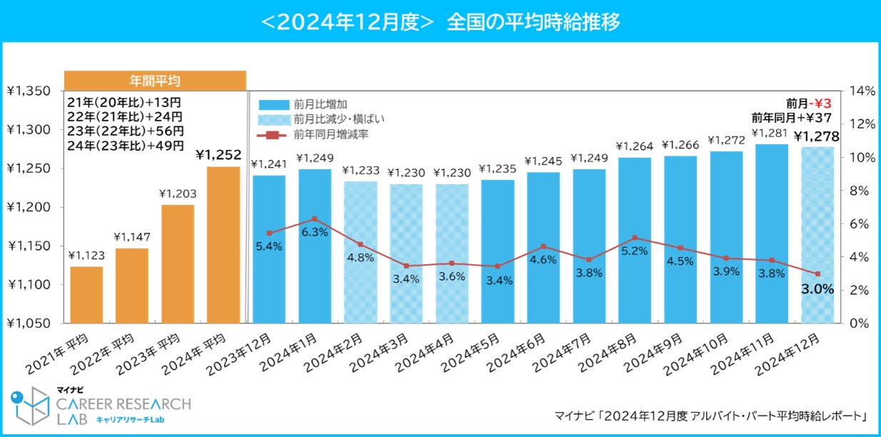 マイナビ、「2024年12月度アルバイト・パート平均時給レポート」を発表
