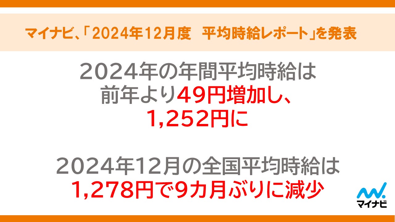 2024年12月の全国平均時給は1,278円(前月比3円減、前年同月比37円増)と9カ月ぶりに減少した。 また、2024年の年間平均時給は1,252円(前年比49円増)となった。
