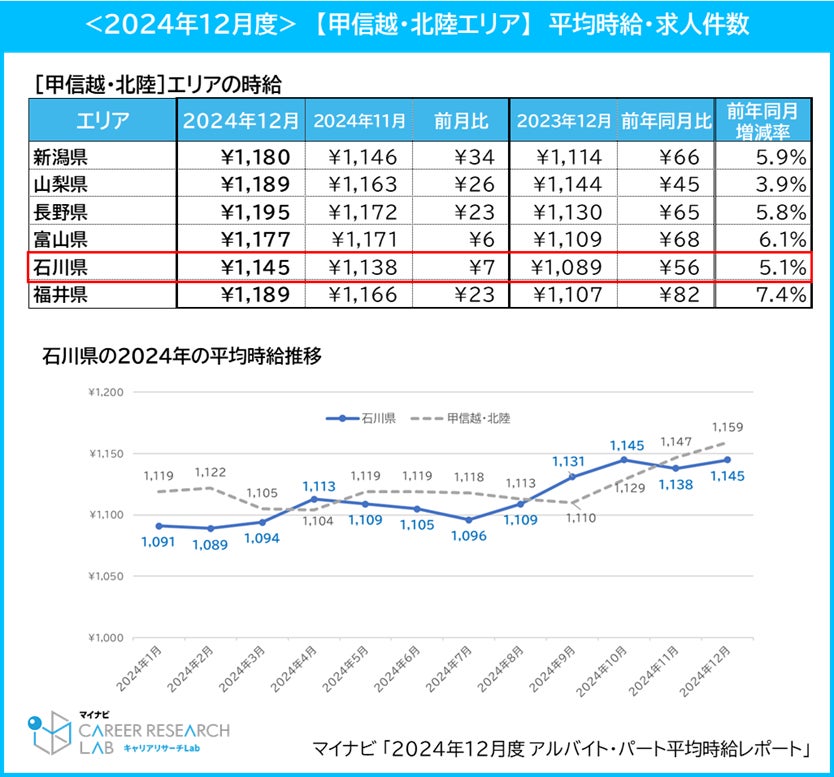 石川県の平均時給は1,145円(前月比7円増、前年同月比56円増)。