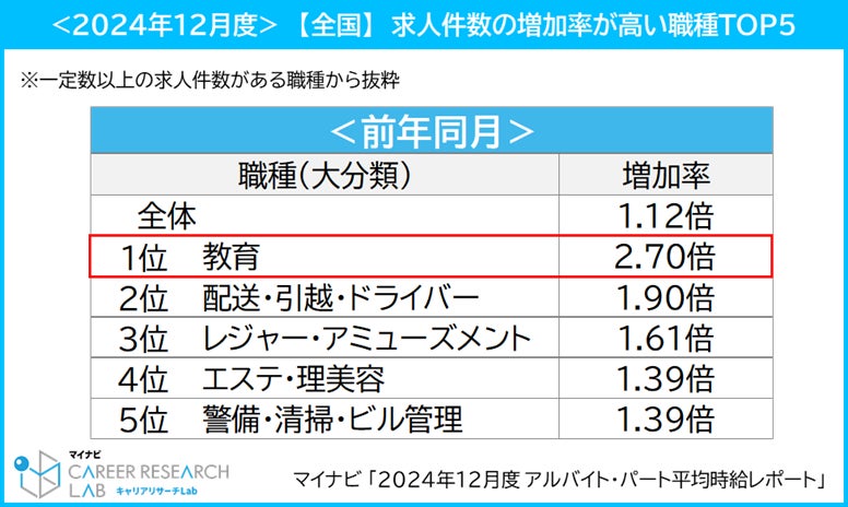 求人件数では[教育]が前年同月比で2.70倍となった。