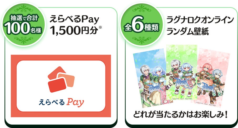・「えらべるPay®」1,500円分/100名様 ・壁紙(全6種よりいずれか)/上記以外の全当選者 ※壁紙の種類は選べません。 |