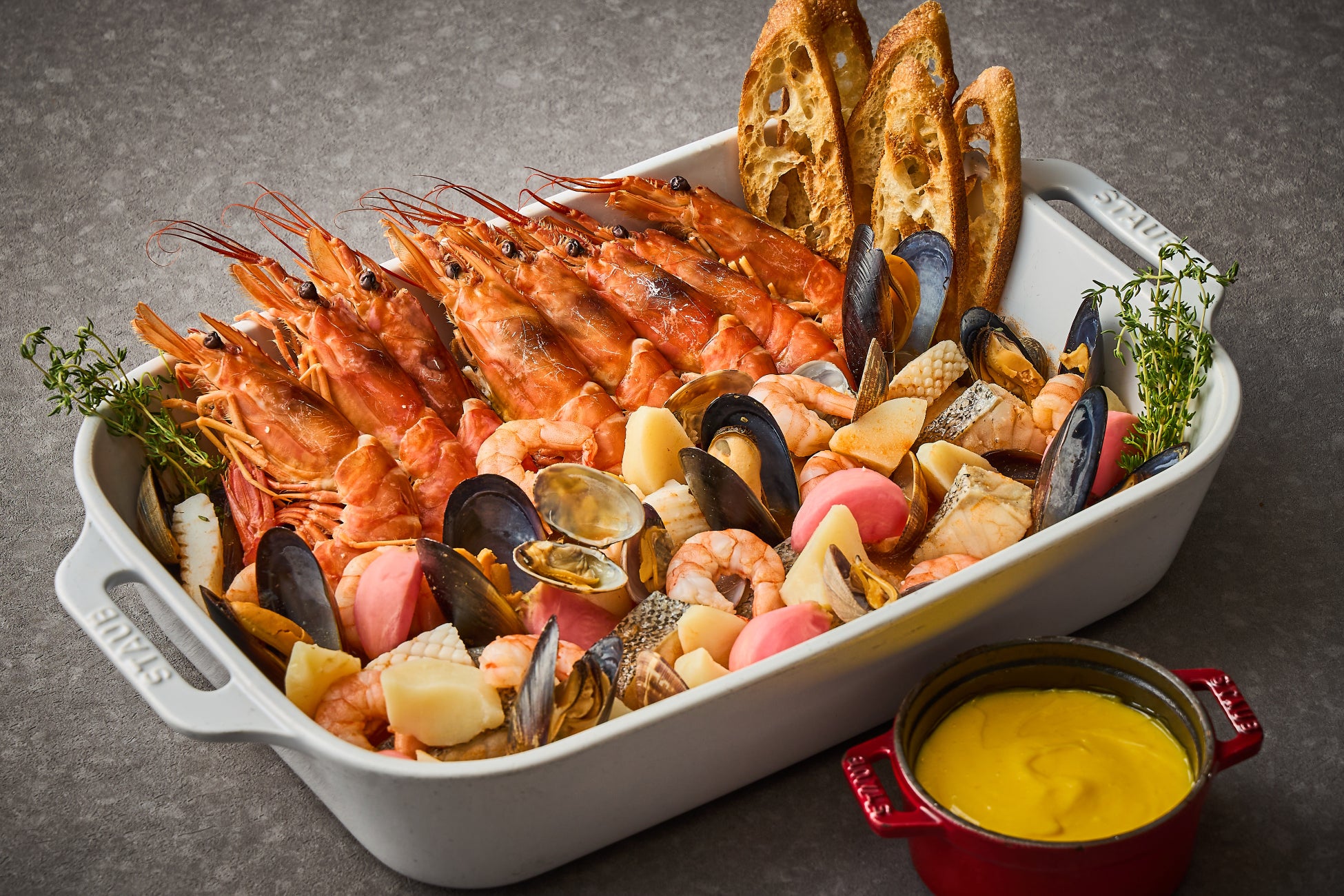 聖夜を彩る限定メニューでは、「クロスダイン」ビュッフェ定番料理ローストビーフを、贅沢に“和牛”を使ってご提供いたします。きめ細かい霜降りが特徴で、適度にサシが入り肉の旨みを感じられる和牛にゆっくりと熱を入れることで、より肉の旨みが溶け出したジューシーで柔らかな食感をお楽しみいただけます。さらに、クリスマスの定番料理「ローストターキー」は旨みをぎゅっと閉じ込めてしっとりとした食感に焼き上げ、香味野菜やハーブを詰め込むことで、深みのある味わいに仕上げました。伝統的なクランベリーソースとともに、華やかな一皿をご堪能ください。マルセイユ名物「ブイヤベース」ルイユ添えは、魚介の旨みがたっぷりと溶け込んだスープに、サフランの豊かな香りが広がる逸品です。赤海老や旬の白身魚、貝類を贅沢に使用し、コクのあるルイユソースと一緒に召し上がっていただくことで、本場さながらの味わいをお楽しみいただけます。