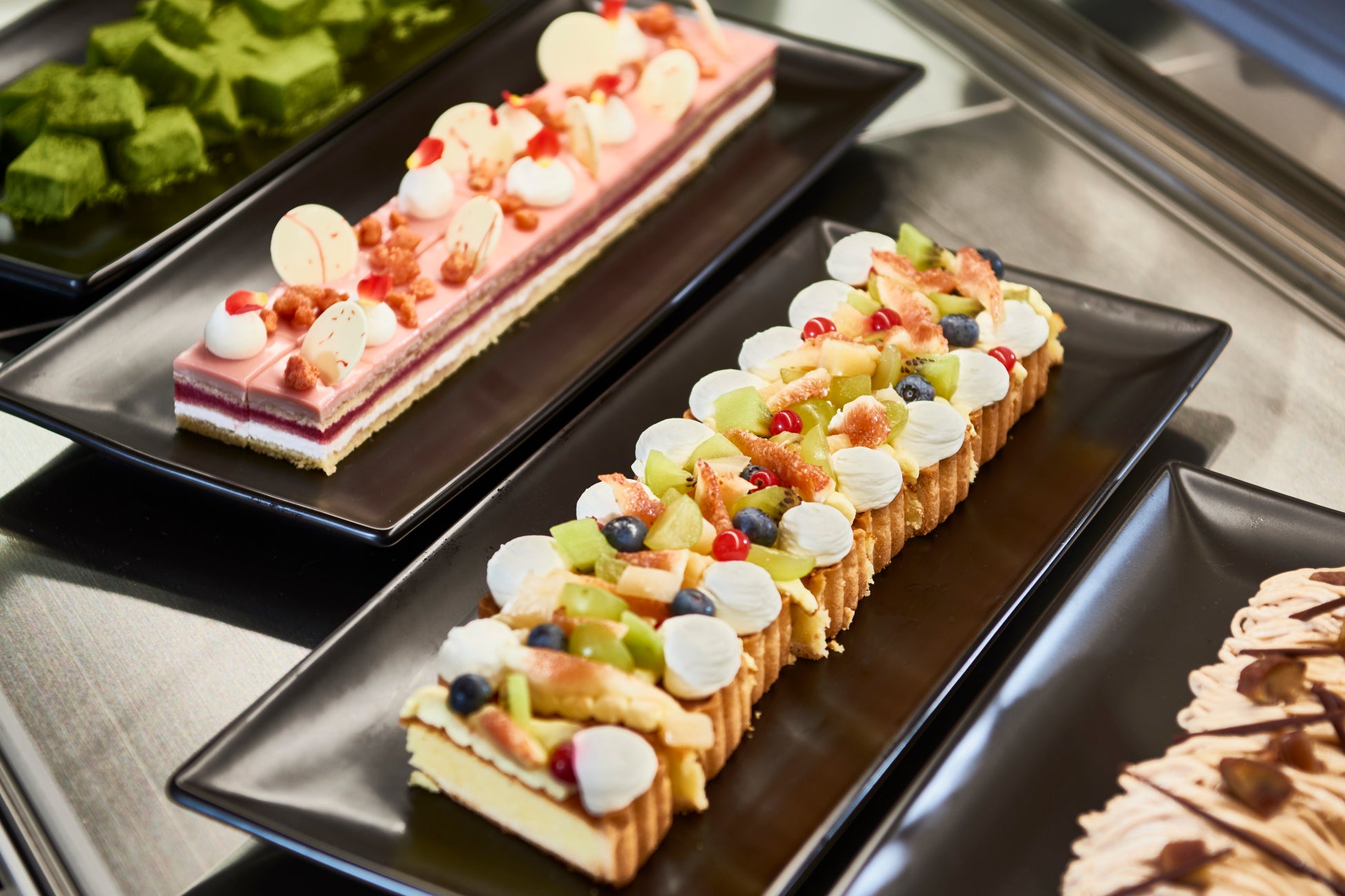 スイーツでは、見た目も華やかでホリデー気分を盛り上げてくれるアイテムを多数ご用意いたします。ホテルパティシエ特製のクリスマス定番ケーキ「ブッシュ・ド・ノエル」は、チョコレートクリームをぬった軽やかなスポンジを巻き、さらに表面をガナッシュでコーティングしました。コクのある甘さのため、お子様はもちろん大人の方もご満足いただける一品になっています。「ノエル・フランボワーズ」は、ビスキュイ生地にフランボワーズのゼリーとチーズムースを重ね、ベリーグラサージュで包んだ、季節感あふれる色鮮やかな甘酸っぱいケーキです。ディナー限定では、お客さまの目の前でひとつずつ仕上げる「ピスタチオの生絞りモンブラン」をご提供します。苺のロールケーキの上に、その場でピスタチオのクリームを絞ってご提供します。苺とピスタチオの絶妙な味のバランスと、口当たり滑らかな出来立てのモンブランをご賞味ください。その他にもクリスマス仕様に飾りをアレンジした「ショートケーキ」や、季節のフルーツを使用したタルト、苺の風味香る優しい甘さの「苺の杏仁豆腐」やクリスマスカラーで濃厚な味わいの「ピスタチオのパンナコッタ」など、心ときめくスイーツの数々をご堪能ください。