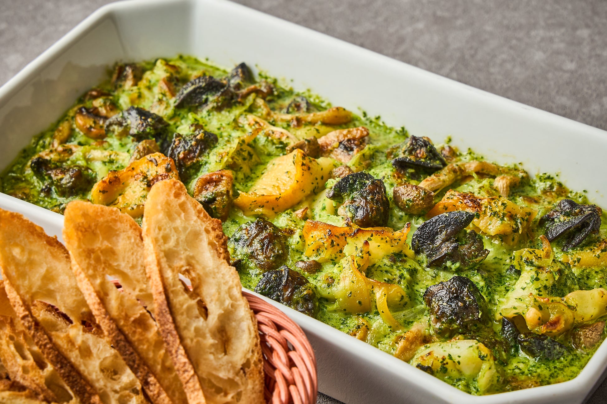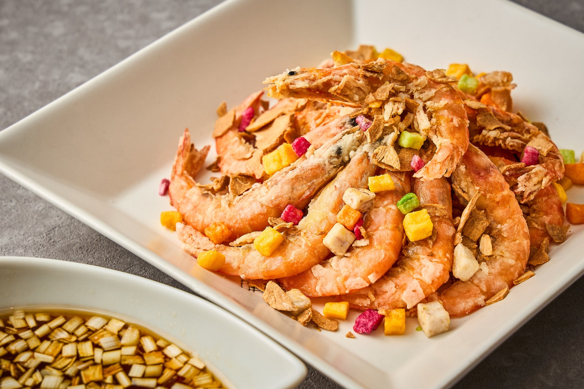 西洋料理からは、エスカルゴとつぶ貝を、ガーリック風味のバターで香ばしく焼き上げた「エスカルゴとつぶ貝のブルギニヨン バケット添え」をご用意いたしました。ガーリックとパセリの豊かな香りが口いっぱいに広がります。カリッと香ばしく焼き上げたバケットとともに、本格的なフレンチをご堪能ください。中国料理からは、殻が柔らかく、頭から尻尾まで丸ごとお召し上がりいただける「ソフトシェルシュリンプ」に下味をつけて、香ばしく揚げました。独特の旨みはそのままでも十分ご堪能いただけますが、甘酢醤油をベースにした油淋ソースとともにお楽しみください。