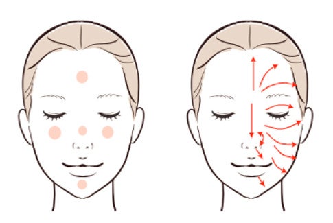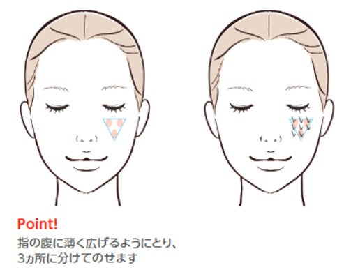 化粧水などで肌を整えた後、手のひらにディスペンサー1回押し分をとり、 顔の5か所(両ほお、額、鼻先、あご)におき、指で顔の中心から外側へのばします。