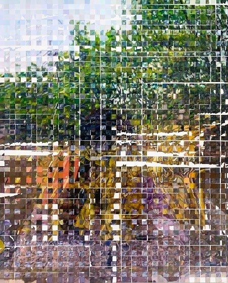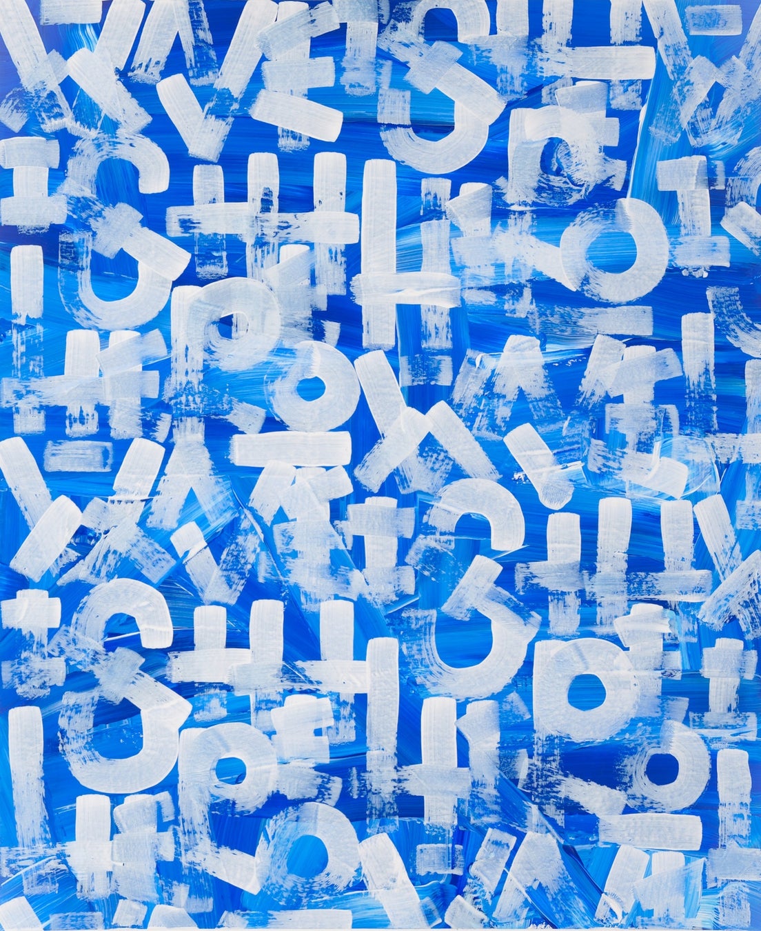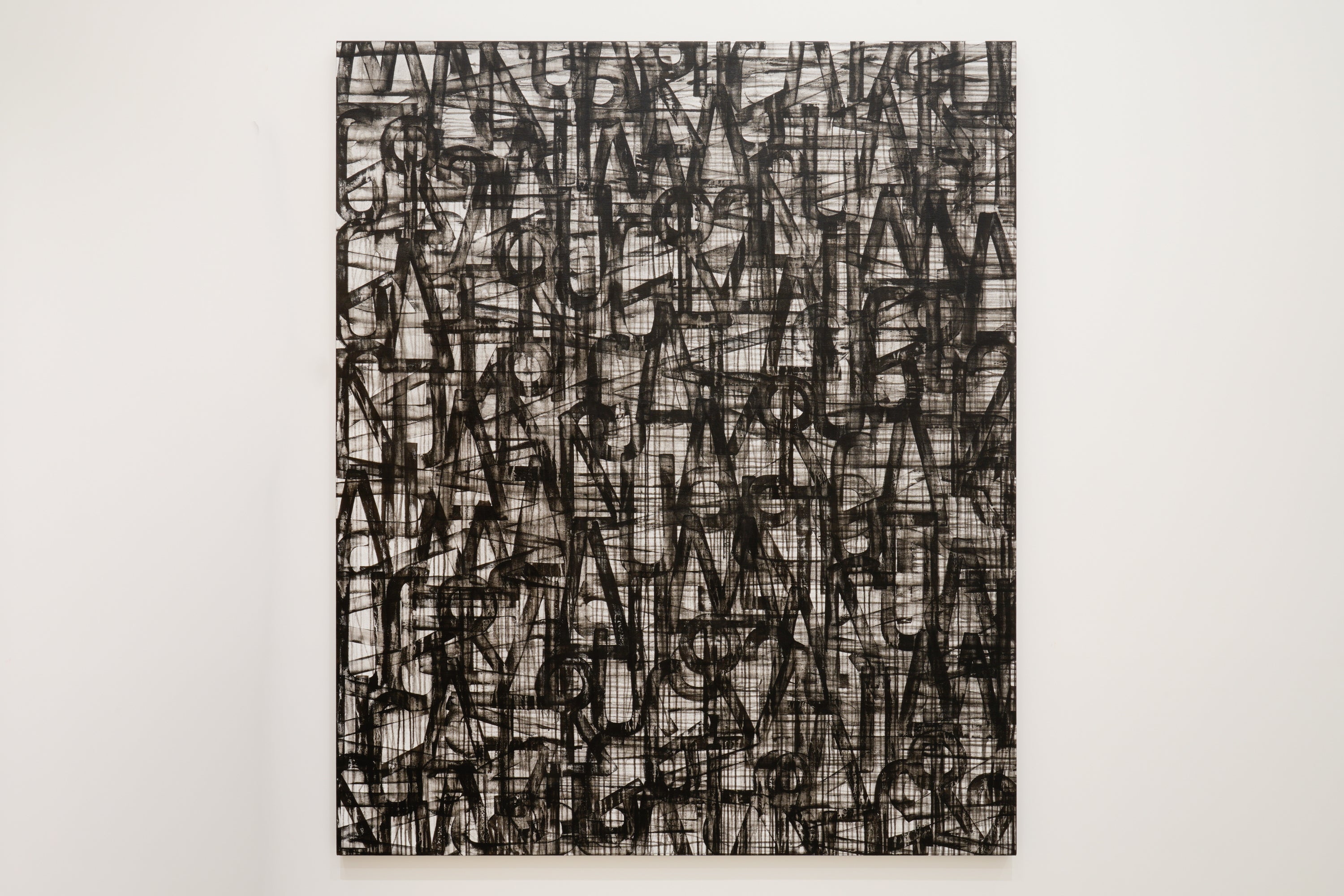 baanaiは、"ARIGATOUGOZAIMASU"をキャンバスに毎日ひたすら描き続けています。言葉は人と人との関係性をつくりますが、これを記号にも近い独自のアルファベットに変換し意思疎通という本来の役割から切り離したのち、何層にも塗り重ねた絵画として着地させていきます。言葉が空間を構成し埋め尽くしていくと同時に、鑑賞者の脳内でメッセージが再構築されることで、 重層的に作家の生きざまを映し出します。