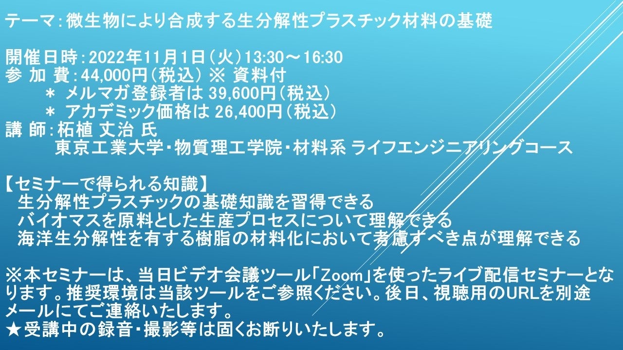 先端技術情報や市場情報を提供している(株)シーエムシー・リサーチ(千代田区神田錦町: https://cmcre.com/ )では、 各種材料・化学品などの市場動向・技術動向のセミナーや書籍発行を行っておりますが、 このたび「微生物により合成する生分解性プラスチック材料の基礎」と題するセミナーを、 講師に柘植 丈治 氏 東京工業大学・物質理工学院・材料系 ライフエンジニアリングコース)をお迎えし、2022年11月1日(火)13:30より、 ZOOMを利用したライブ配信で開催いたします。 受講料は、 一般:44,000円(税込)、 弊社メルマガ会員:39,600円(税込)、 アカデミック価格は26,400円(税込)となっております(資料付)。