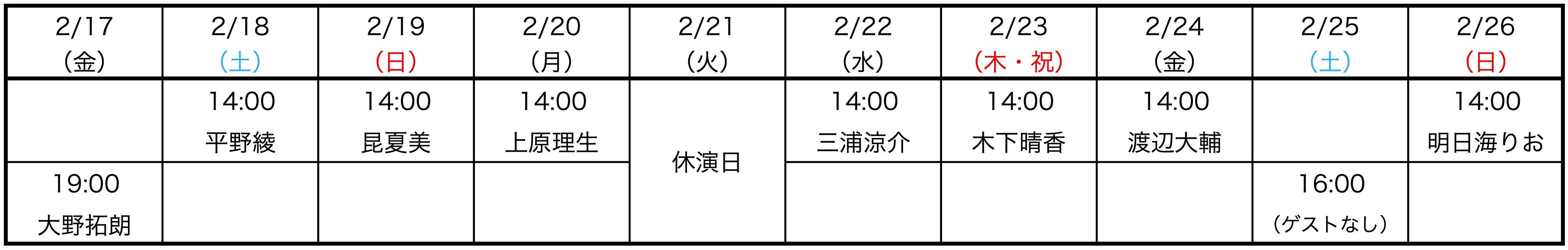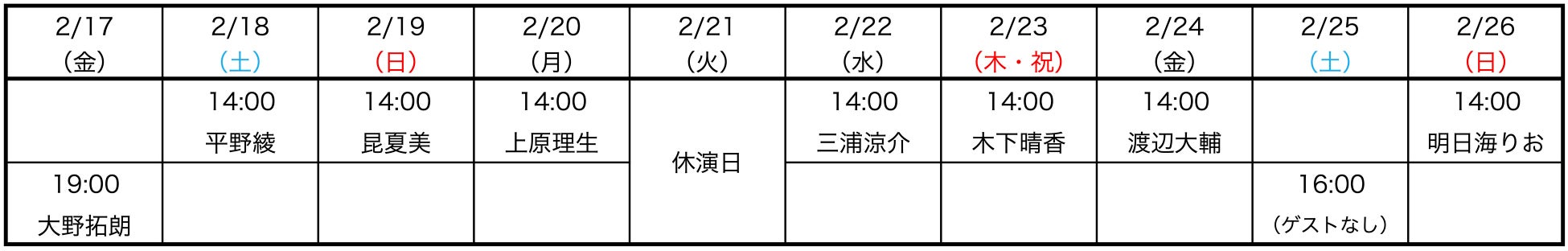 ゲストは、ミュージカルの第一線で活躍し、古川とも縁の深い8名が日替わりで登場する。17日は、『エリザベート』ではルドルフ役、『ロミオ&ジュリエット』ではロミオ役でWキャストとして切磋琢磨した大野拓朗。18日は、『レディ・ベス』『モーツァルト!』で共演した平野綾。19日は、『ファースト・デート』『マリー・アントワネット』で共演した昆夏美。20日は、『1789 -バスティーユの恋人たち-』で革命家仲間を熱く演じた上原理生。22日は、『エリザベート』やミュージカル「黒執事」での共演が印象深い三浦涼介。23日は『ロミオ&ジュリエット』『モーツァルト!』で恋人役を演じた木下晴香。24日は、ミュージカル『テニスの王子様』以来、公私に渡り親しい仲である渡辺大輔。そして千秋楽は元宝塚歌劇団花組トップスターで、第一弾が初共演となった明日海りおが登場する(25日のみゲストなし)。