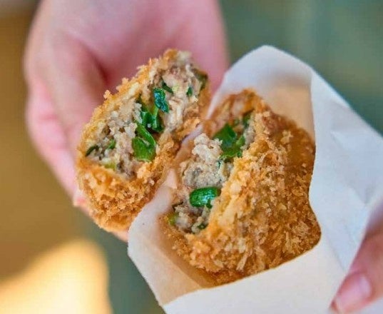 熊本県全体の出荷量の約25%、年間約300トンを出荷するなどにらの産地として知られる甲佐町。ここであたらしい名物として人気を集めるのが、にらの入ったメンチカツ“にらメンコ。”です。