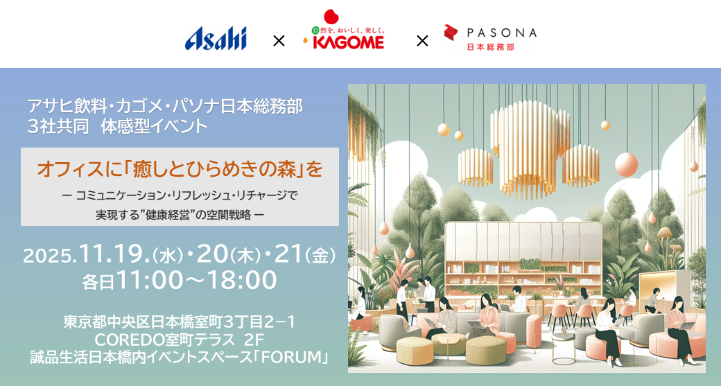 株式会社パソナ日本総務部(本社:大阪市中央区、代表取締役社長 佐野克也)は、アサヒ飲料株式会社(以下、アサヒ飲料)、カゴメ株式会社(以下、カゴメ)と共に、健康経営やウェルビーイング向上に寄与するオフィスの体験型イベント『オフィスに「癒しとひらめきの森」を~コミュニケーション・ リフレッシュ・リチャージで実現する”健康経営”の空間戦略~』を、2025年11月19日(水)から21日(金)まで、COREDO室町テラス 誠品生活日本橋イベントスペース内「FORUM」にて開催いたします。