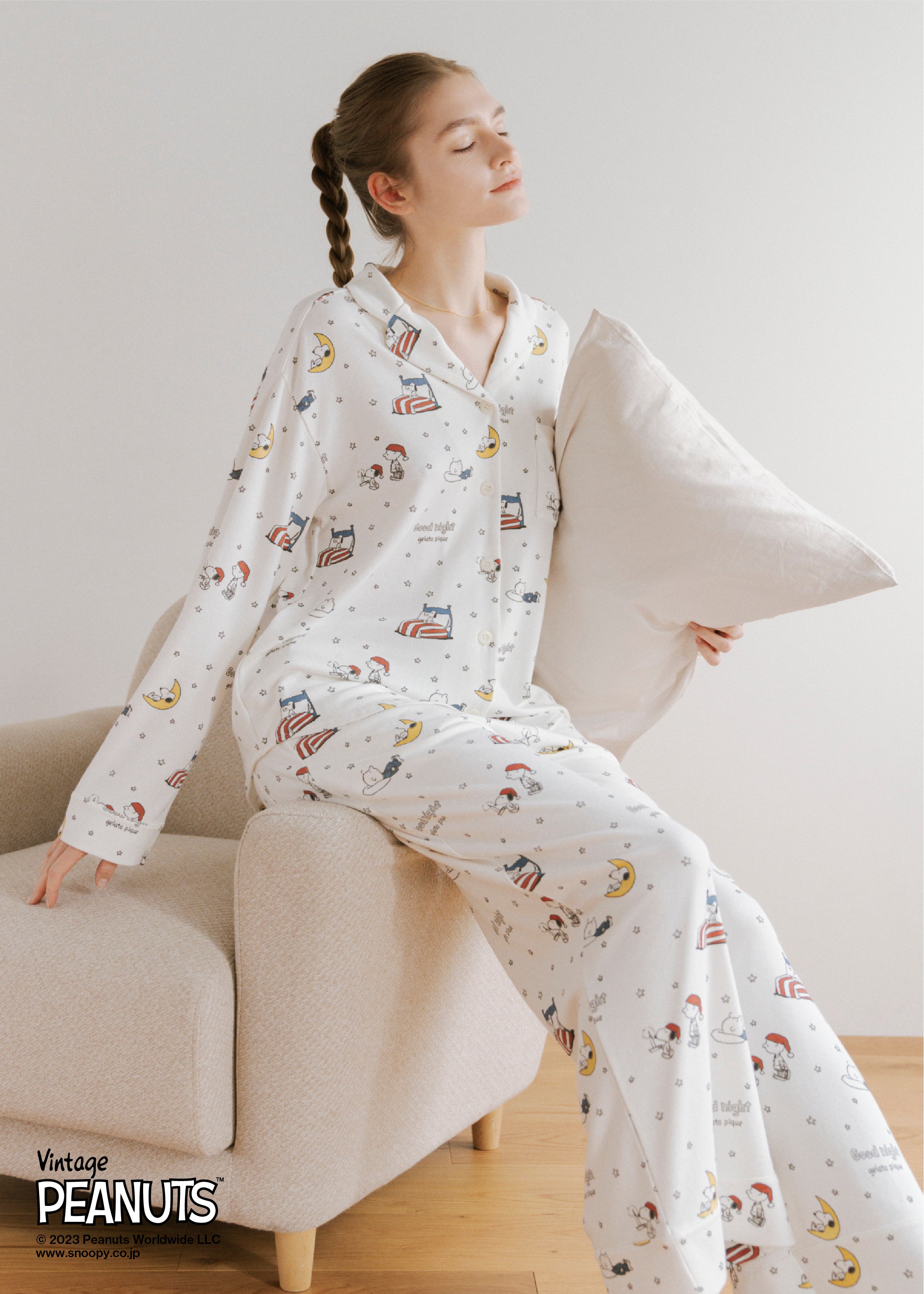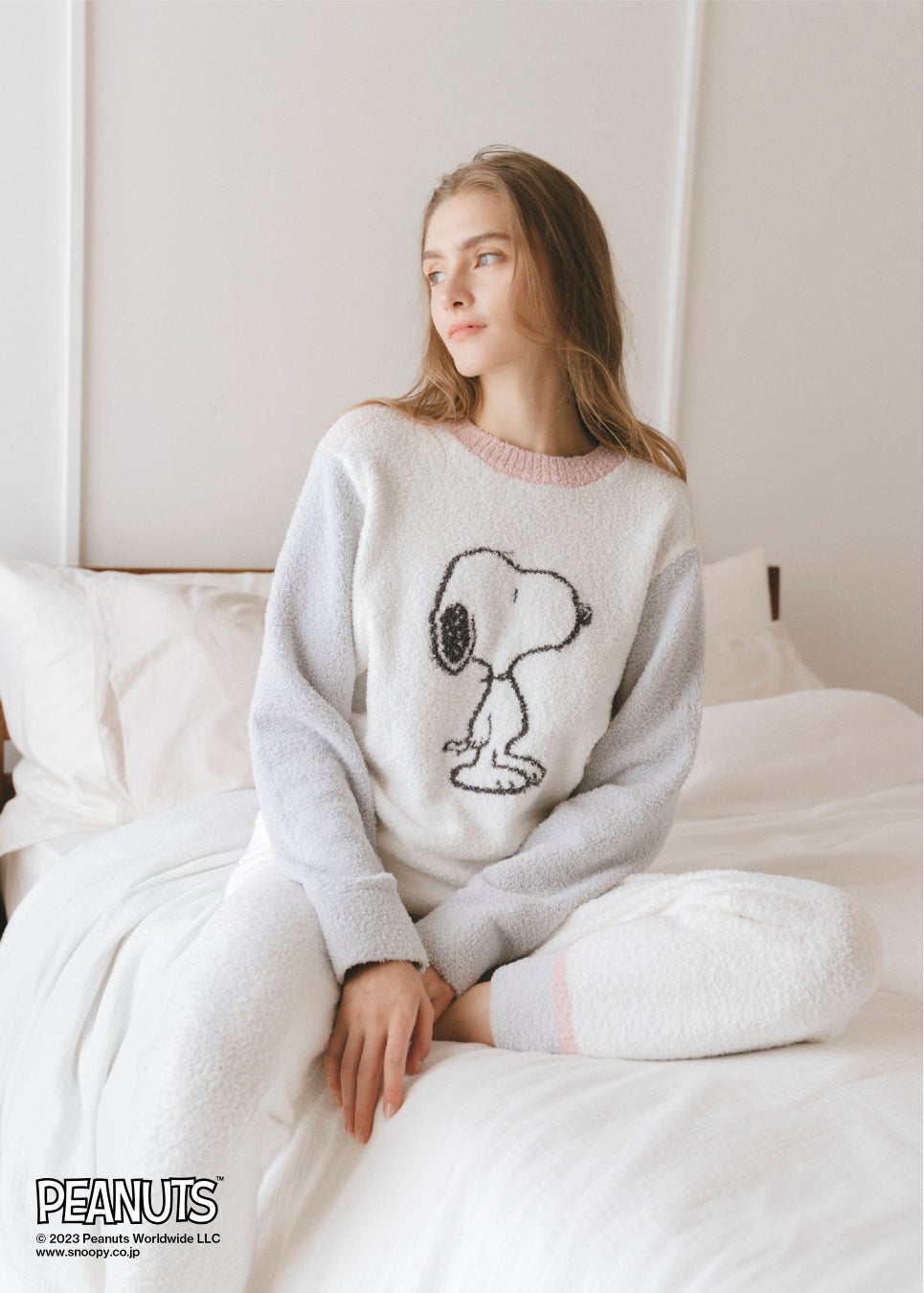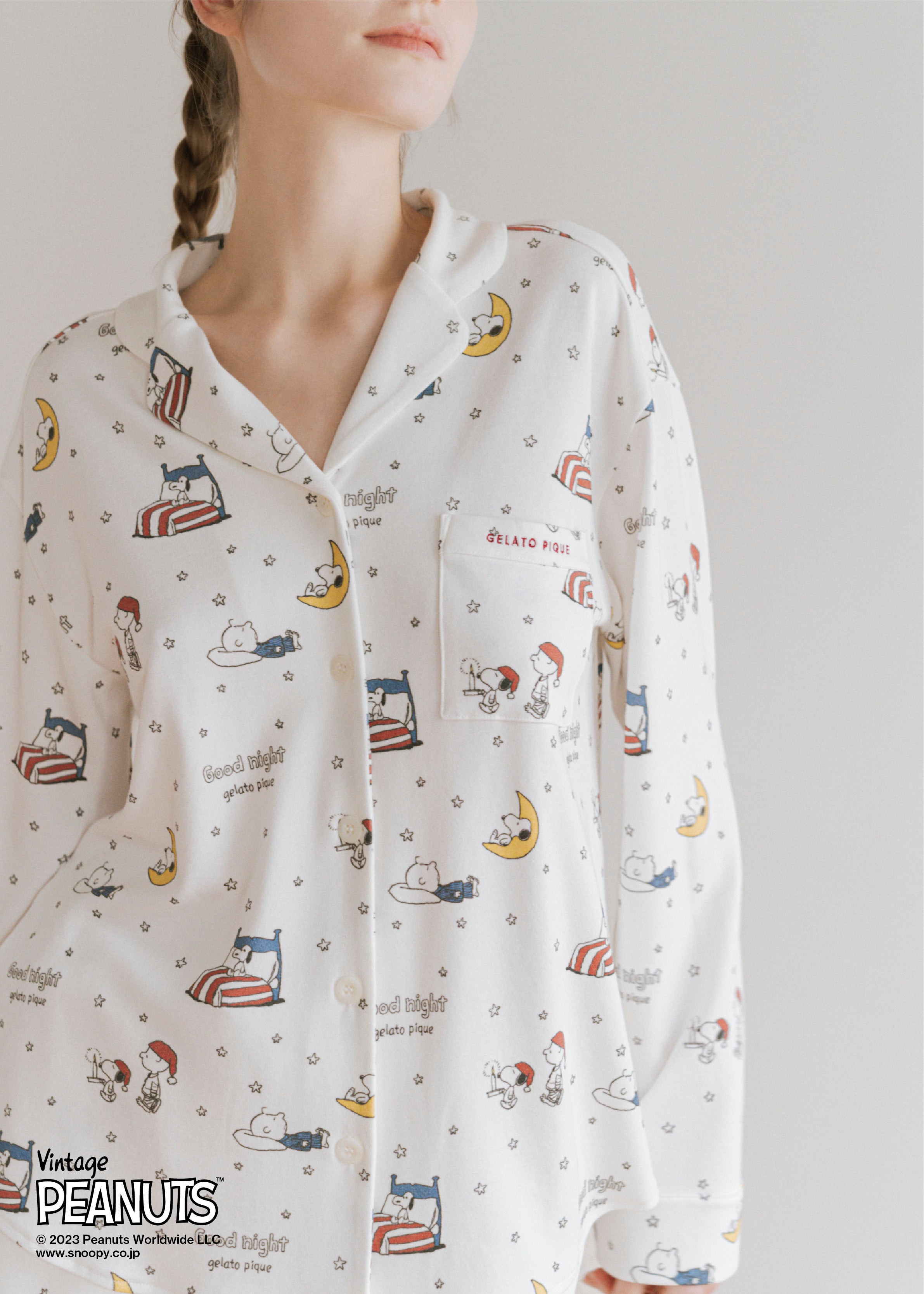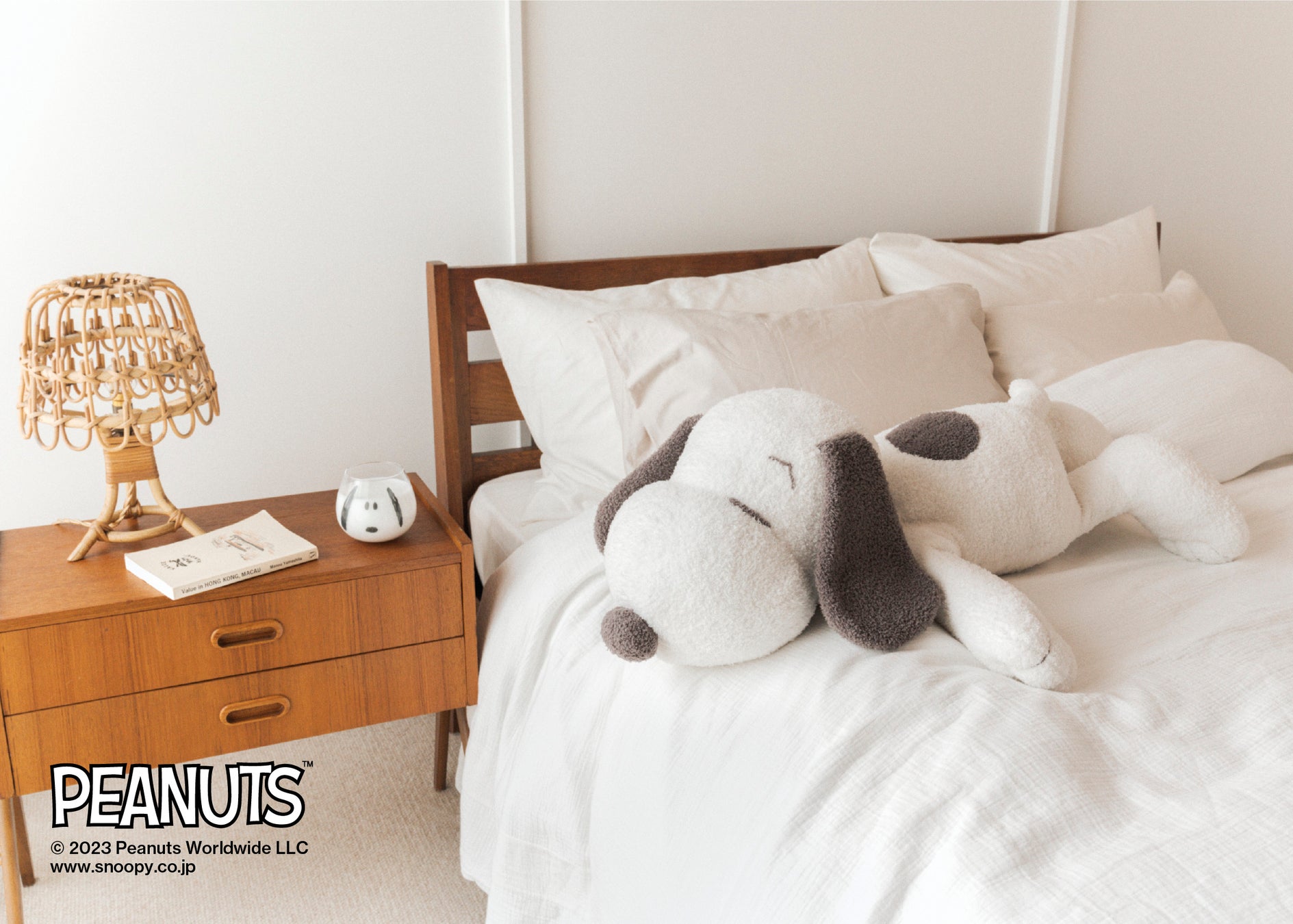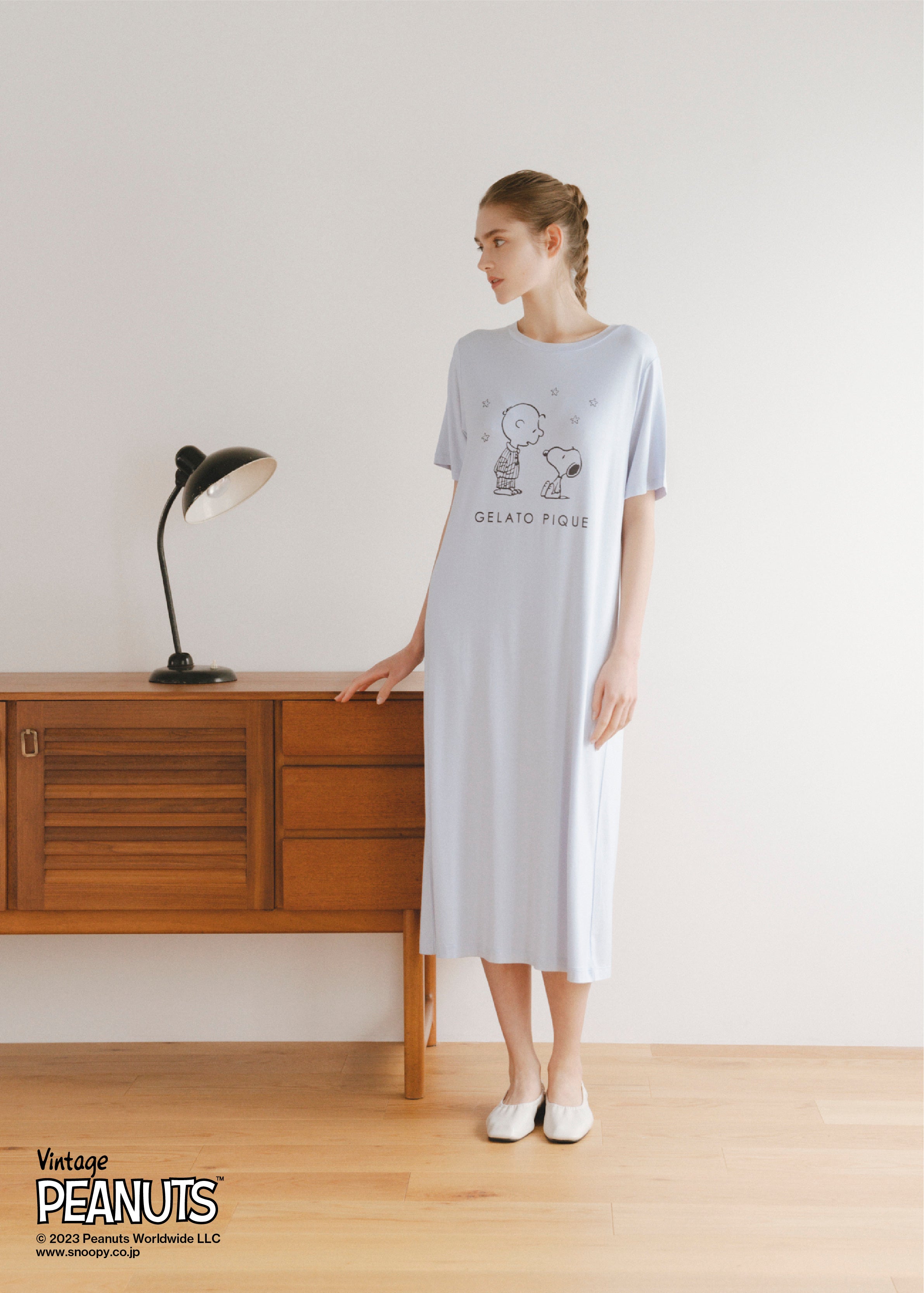 ベッドの上にいるスヌーピーのぬいぐるみのアートは、ジェラート ピケオリジナルで描き起こしたベッドタイム柄です。同シリーズでワンピースもラインアップしています。