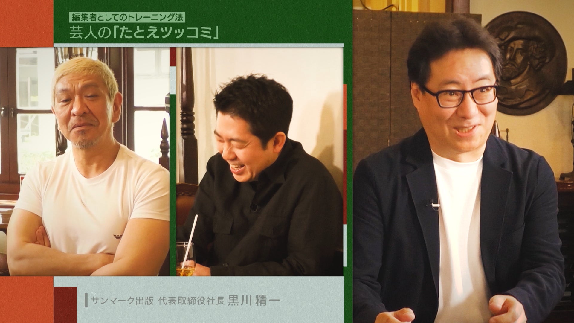 出版界の今後について話していく中で、黒川さんが松本に「本をお書きになりませんか?」とお願いする一幕も。松本のフリートークや立ち振る舞いなどを見ていると、正解かどうかは別として「◯◯が嫌いそう」など、おおまかなイメージが湧くと黒川さん。ただ、松本が書くエッセイから“何を大切にしているのか”を紐解くことで「誰も知らない松本人志」に出会えるとプレゼンします。