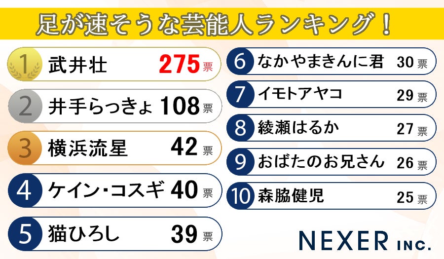 競技実績を持つかテレビ番組を通じて俊足の印象を強く残した芸能人が上位を占める結果となりました。