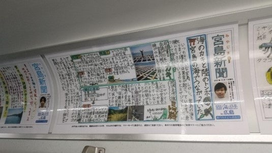 完成した「新聞」と子どもたちの絵やイラストで飾られた世界唯一の特別電車は、これから1か月間、毎日たくさんの人が通勤通学で利用し、全国や海外からの観光客も乗る、宮島線と広島市内を走ります。さらに子どもたちの絵とイラストは地元和菓子メーカーの特別限定商品に刻印し「宮島の海のいきもの饅頭」として特別パッケージで販売中です。子どもたちが力を合わせて作った、世界に一つだけの夢の電車、そして宮島の海を感じるお土産「宮島の海のいきもの饅頭」。「瀬戸内こども調査団」の子どもたちは、自分たちの、地元の海を大切に思い守っていくという決意表明が、一人でも多くの人の目に触れ、一人でも多くの人の手に渡ることを心から祈っています!!