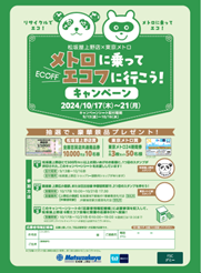 東京地下鉄株式会社(本社:東京都台東区、代表取締役社長:山村 明義、以下「東京メトロ」)と株式会社大丸松坂屋百貨店(本社:東京都江東区、代表取締役社長:宗森 耕二、以下「大丸松坂屋百貨店」)が運営する松坂屋上野店は、2024年9月13日(金)~10月21日(月)の間で、「メトロに乗ってエコフに行こう!キャンペーン」を実施します。エコフ※とは、「環境に配慮したECOなリユース・リサイクル活動を通じ、お客様の負担や地球への負荷をOFFする」プロジェクトのことを指します。このたび2社共同で、環境にやさしい電車に乗って「エコフ」を進めるキャンペーンを実施し、脱炭素化への取組みを推進します。