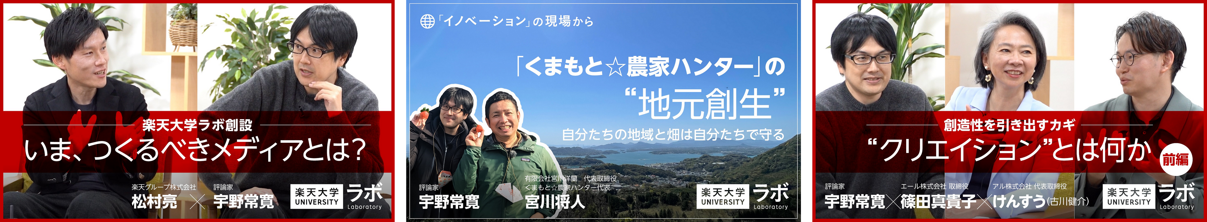 「楽天大学ラボ」は、「イノベーションを通じて、人々と社会をエンパワーメントする」という楽天グループのミッションに基づいて楽天が開設する、ビジネスパーソン向けの学びの場です。評論家の宇野 常寛氏をアドバイザーに迎え、各業界で活躍する多種多様な有識者の知見を交えながら、各領域の知識・教養を横断的に発信します。本メディア上では今後、定期更新される有識者の講義・対談などの動画配信を予定しています。