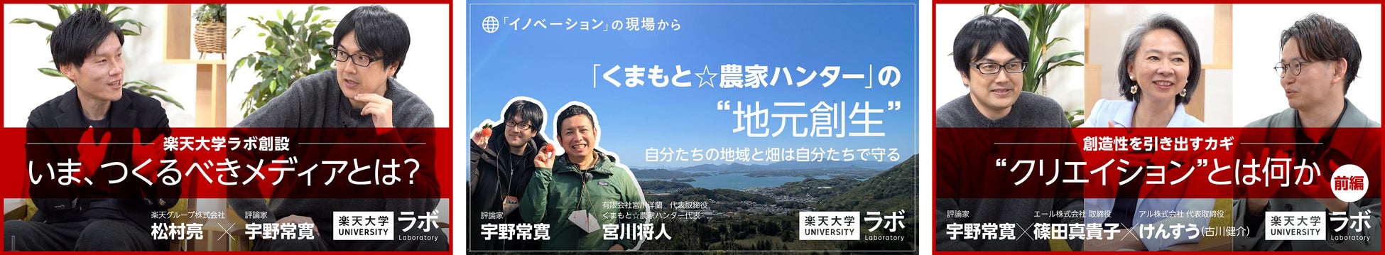 概要: 「イノベーションを通じて、人々と社会をエンパワーメントする」という楽天グループのミッションに基づいて楽天が開設する、ビジネスパーソン向けの学びの場です。評論家の宇野 常寛氏をアドバイザーに迎え、各業界で活躍する多種多様な有識者の知見を交えながら、各領域の知識・教養を横断的に発信します。本メディア上では今後、定期更新される有識者の講義・対談などの動画配信を予定しています。