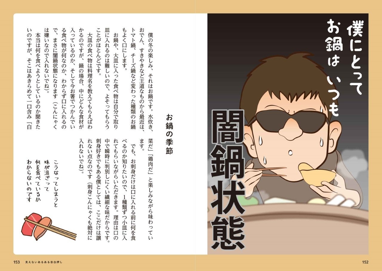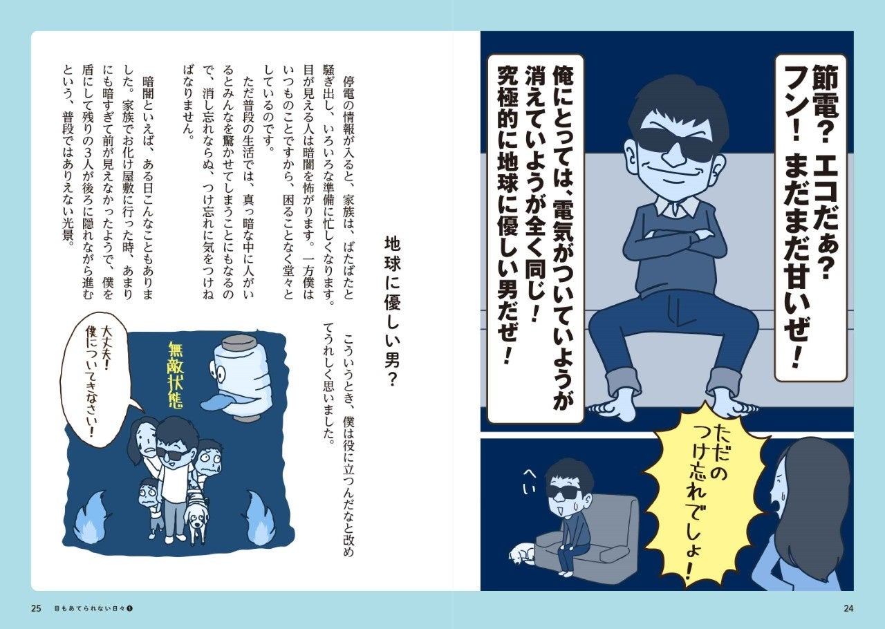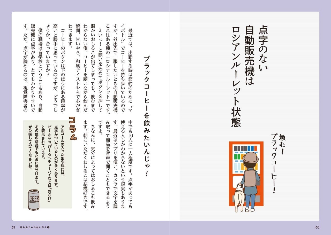 「盲導犬と間違えて人の頭をなでてしまった!」「電気がついていようが消えていようが、全く同じ!」「点字のない自動販売機はロシアンルーレット状態」「ボクにとってお鍋はいつも闇鍋状態」 …目の見える人が知っているようで知らない、著者と盲導犬「二人」の身の回りに起きる日常の出来事がてんこ盛り。インスタグラムで人気のあった作品に、書きおろしエッセイと新作マンガを加えた完全版。ほのぼのとしたエピソードが、ユーモラスに、ときにちょっぴり悲しく描き出されます。