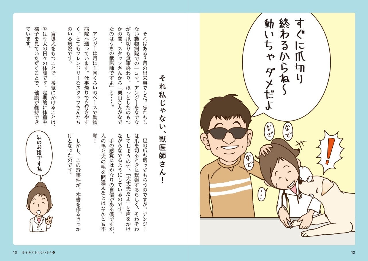 小学5年生で完全失明した盲学校教師であり、シンガーソングライターの栗山龍太氏と、盲導犬アンジーの日常を綴るコミックエッセイ。3月15日発売です。