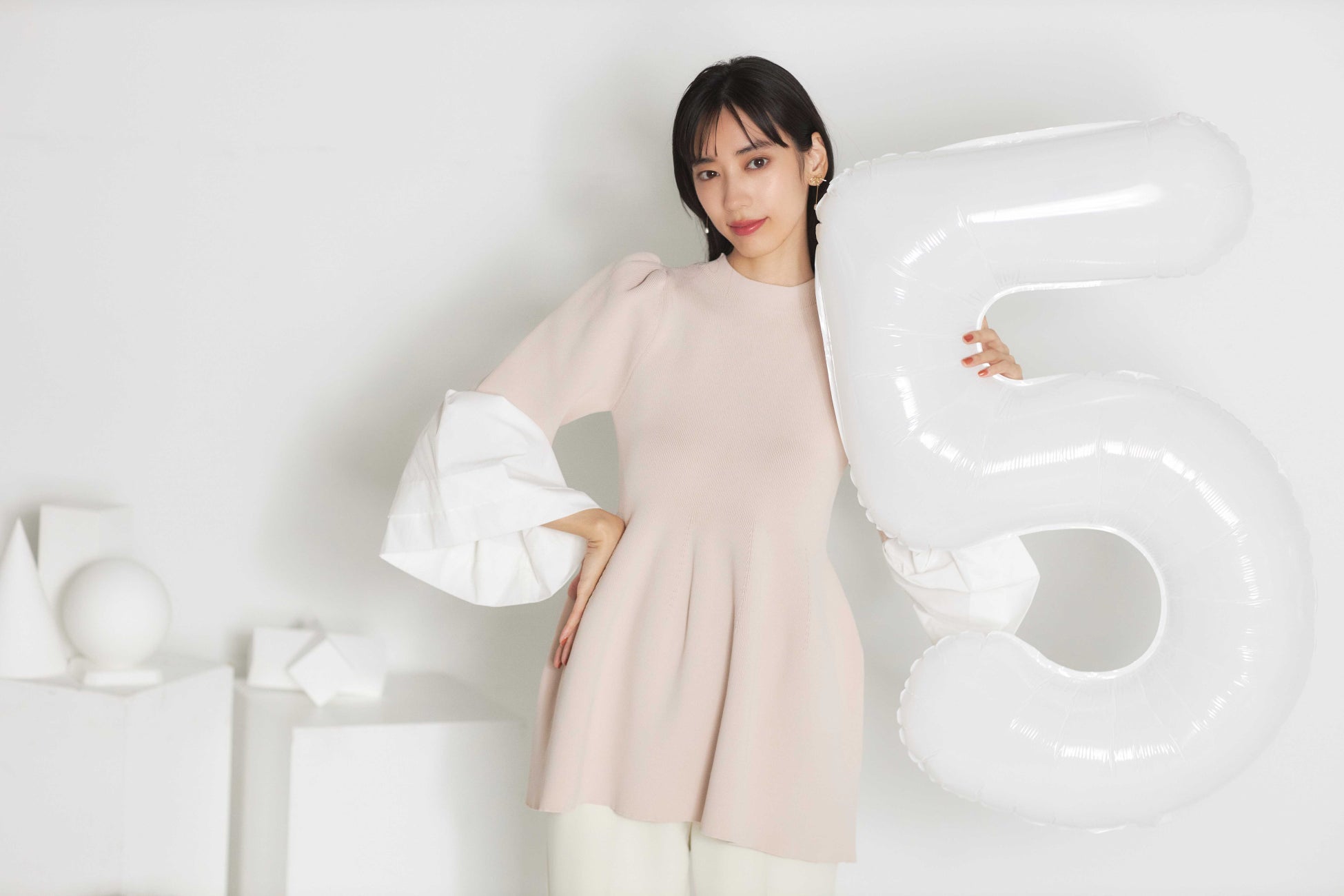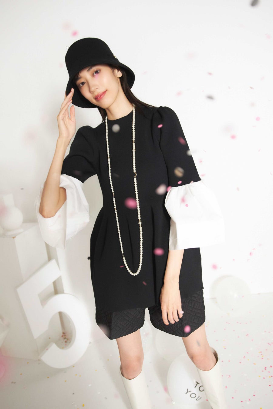 腰周りのペプラムやハリ感のあるベルスリーブのボリュームが際立ち、着るだけで今っぽいバランスに。