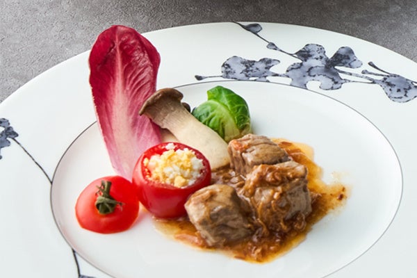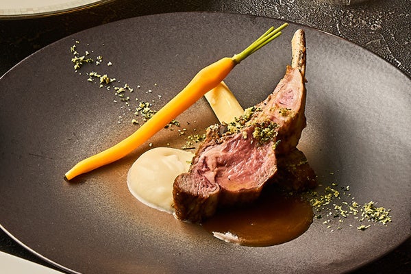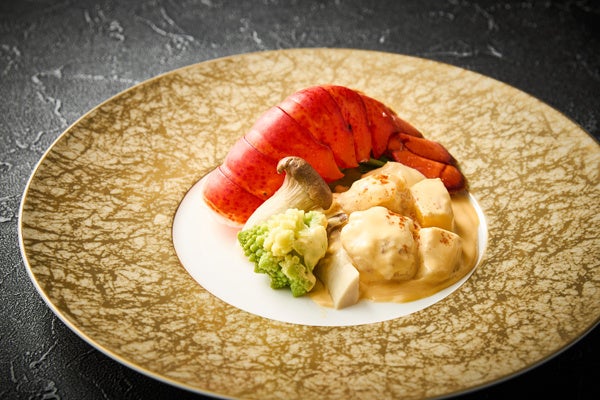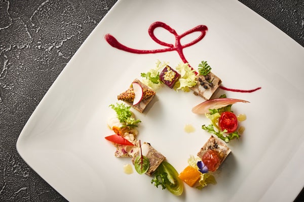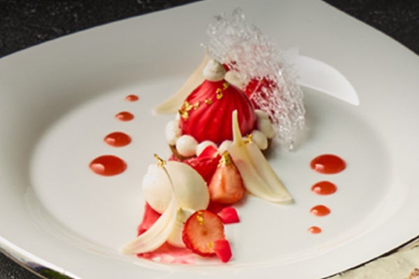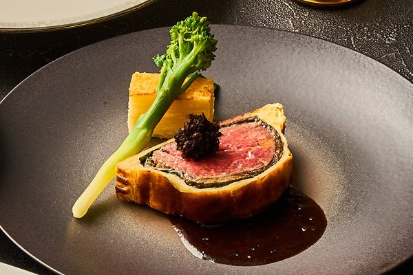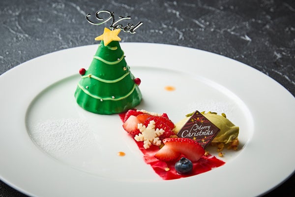 2025年9月8日にリニューアルオープンしたばかりのキュイジーヌ「エスト」では、地上100mからの夜景を眺めながら煌めくクリスマスにふさわしい洗練された極上の本格フランス料理のフルコースをお楽しみいただけます。前菜の「フォアグラ入りパテ・ド・カンパーニュ」はクリスマスリースに見立てて盛り付け、周りにオーナメントをイメージした彩り野菜を飾り、ホリデームードを演出します。スープはマッシュルームと魚介のマリアージュを味わえ、濃厚なブラウンマッシュルームと、海老、帆立貝の香りが口の中で引き立ちます。魚料理は、甘鯛の身の柔らかさと、カリっと焼き上げた鱗のサクサク感がたまらない一品です。メインディッシュの「国産牛フィレ肉のウエリントン」は、国産牛にきのこのペーストをまとわせ、パイで包んで焼き上げました。しっとりジューシーな肉質をパイのコクやきのこの旨みとともに、トリュフを使った贅沢で濃厚なソースでご堪能ください。クセが少なく柔らかな「ニュージーランド産骨付き仔羊のロースト」は、素材の味を生かしつつ、上品な香りと爽やかな味わいが特徴のパースニップ(白にんじん)のピュレと一緒にお召し上がりください。ホワイトチョコレートでコーティングされたドームを割ると、あまおう苺とベリーのソースがとろりと出てくる印象的なデザートで食事を締めくくります。美味しい食事と洗練されたスタッフによる接客で贅沢なクリスマスをお楽しみください。