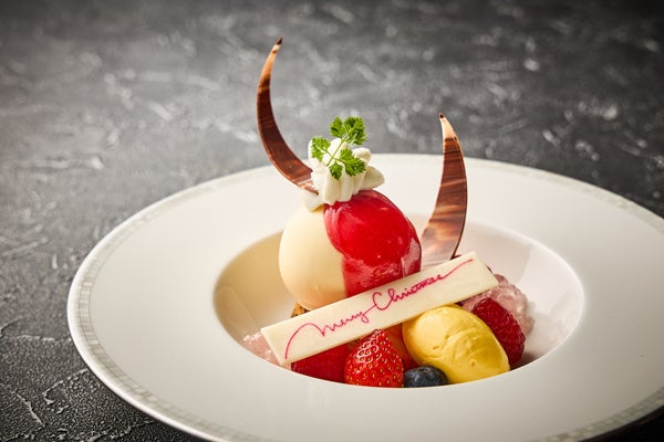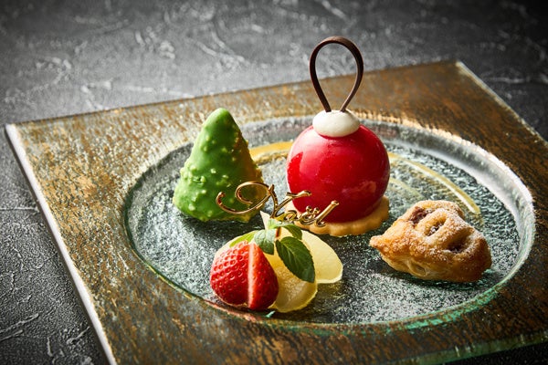 食材がもつ旨味をいかした炙り・炭火&鉄板焼き料理の四季彩茶寮「旬香」より、見た目も華やかなクリスマスディナー「旬香聖和」をお贈りします。“ふぐ”や“フォアグラ”、“キャビア”など、豪華食材をアクセントに使用した前菜盛り合わせをはじめ、プレゼントをイメージしてラッピングされた「海老とムール貝のブイヤベース淡雪仕立て」や、厳選した 5 種類の食材(国産牛・銘柄豚・銘柄鶏・旬魚・魚介類)から2種類お選びいただけるメインディッシュなど、西洋料理のエッセンスも取り入れつつ、日本料理の技巧を用いながら仕上げたクリスマス期間限定のコース料理をお楽しみいただけます。ホテルパティシエ特製「ペール・ノエルのプティガトー」は、サンタクロースの帽子をイメージしたデザインに、柔らかなバニラムースと苺の酸味、ほんのり香るバラのゼリーが一体となった大人な味わいのクリスマスデザートです。