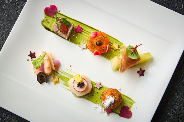 かぼちゃ茶碗蒸し ふぐの焼き霜 カラフルトマトのカクテル フォアグラの西京漬け東寺揚げ 甘海老とキャビアの糀和え |