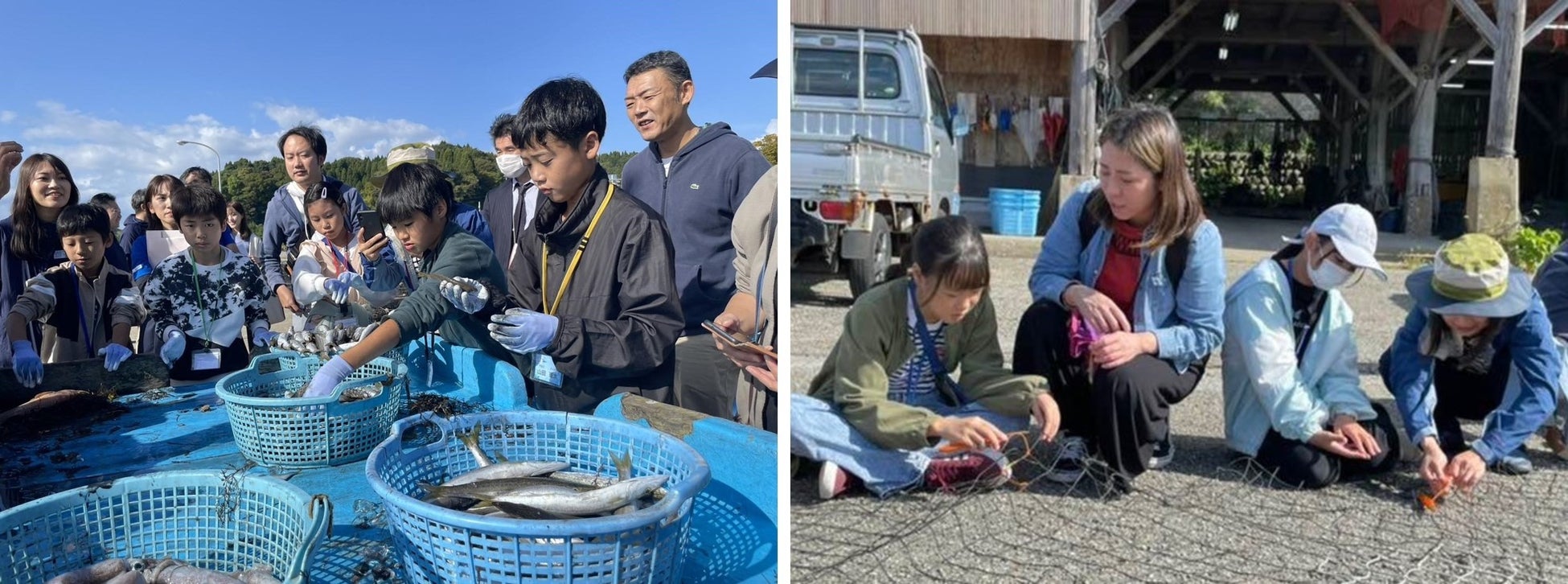 また、定置網の修復も体験。﨑田さんからやり方を聞いた後、親子で協力して作業を進めました。大変なイメージがある漁師の仕事について、ざっくばらんに質問やコメントが飛び交う場面も。最後に「たくさん魚を食べてくださいね」と呼びかけた﨑田さん。魚を獲るだけではない漁師のさまざまな仕事を見て、聞いて、体験した時間でした。