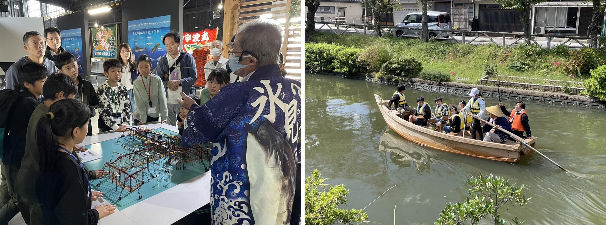 引き続き同センターで、かつて氷見の漁で使われていた木造和船を見学しました。案内してくださったのは、船大工の番匠さんです。現在は特殊なプラスチック製の漁船が主流ですが、番匠さんは伝統文化を守るために和船づくりを続けているそう。和船の歴史や特徴などを聞いた後、子どもたちは市内を流れる湊川へ移動。実際に和船に乗船し、その乗り心地を体感しました。この日は天気が良く風も少なかったため「楽しかった」「気持ちよかった」という感想が多かった一方で、「この船で漁に出ていたのはすごい」と感心する声もありました。