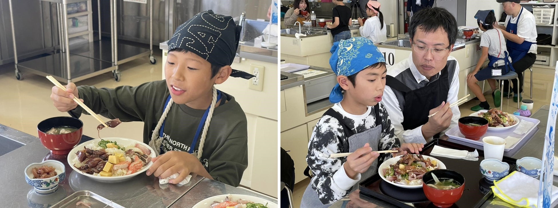 自分でさばいたフクラギがのったちらし寿司は、薮田漁港で選別した魚を入れたかぶす汁(氷見の漁師飯)とともにいただきました。「美味しい!」と親子で話す声があちこちから聞こえ、子どもたちはあっという間に完食。山下さんは最後に「初めてで難しかったかもしれませんが、ぜひお家でも挑戦してみてください」とメッセージを送り、子どもたち一人ひとりにさばけるマスターの認定証を手渡しました。