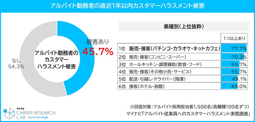 株式会社マイナビ(本社:東京都千代田区、代表取締役 社長執行役員:土屋芳明)は、直近1年以内にアルバイト採用業務に携わった会社役員・自営業含む20~69歳の会社員(有効回答数:1,500名)を対象に実施した「アルバイト従業員へのカスタマーハラスメント※実態調査」の結果を発表しました。本調査は直近1年間の採用実績や担当者の意識・ニーズ、具体的な施策を聴取し、業種別の特徴・傾向の違いを把握することを目的とし、今回が初めての実施となります。