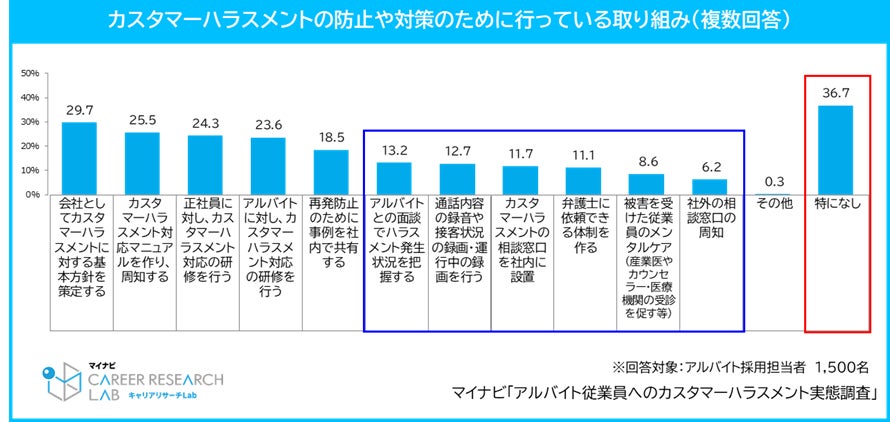 カスタマーハラスメントの防止や対策の有無を聞いたところ「特になし」が最も多く36.7%を占めた。