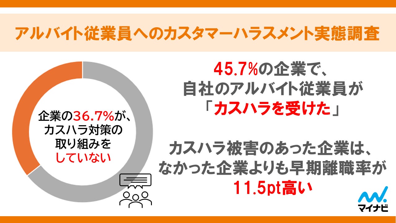 45.7%の企業で、自社のアルバイト従業員が「カスハラを受けた」。企業の36.7%が、カスハラ対策の取り組みをしていない。カスハラ被害のあった企業は、なかった企業よりも早期離職率が11.5pt高い