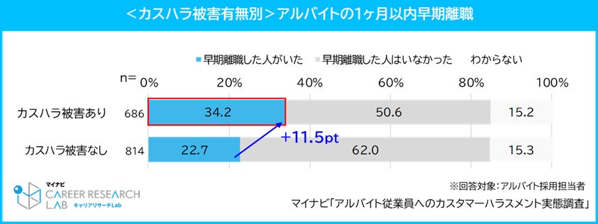 ◆カスハラ被害のあった企業は、被害がなかった企業より「早期離職あり」が11.5pt高い