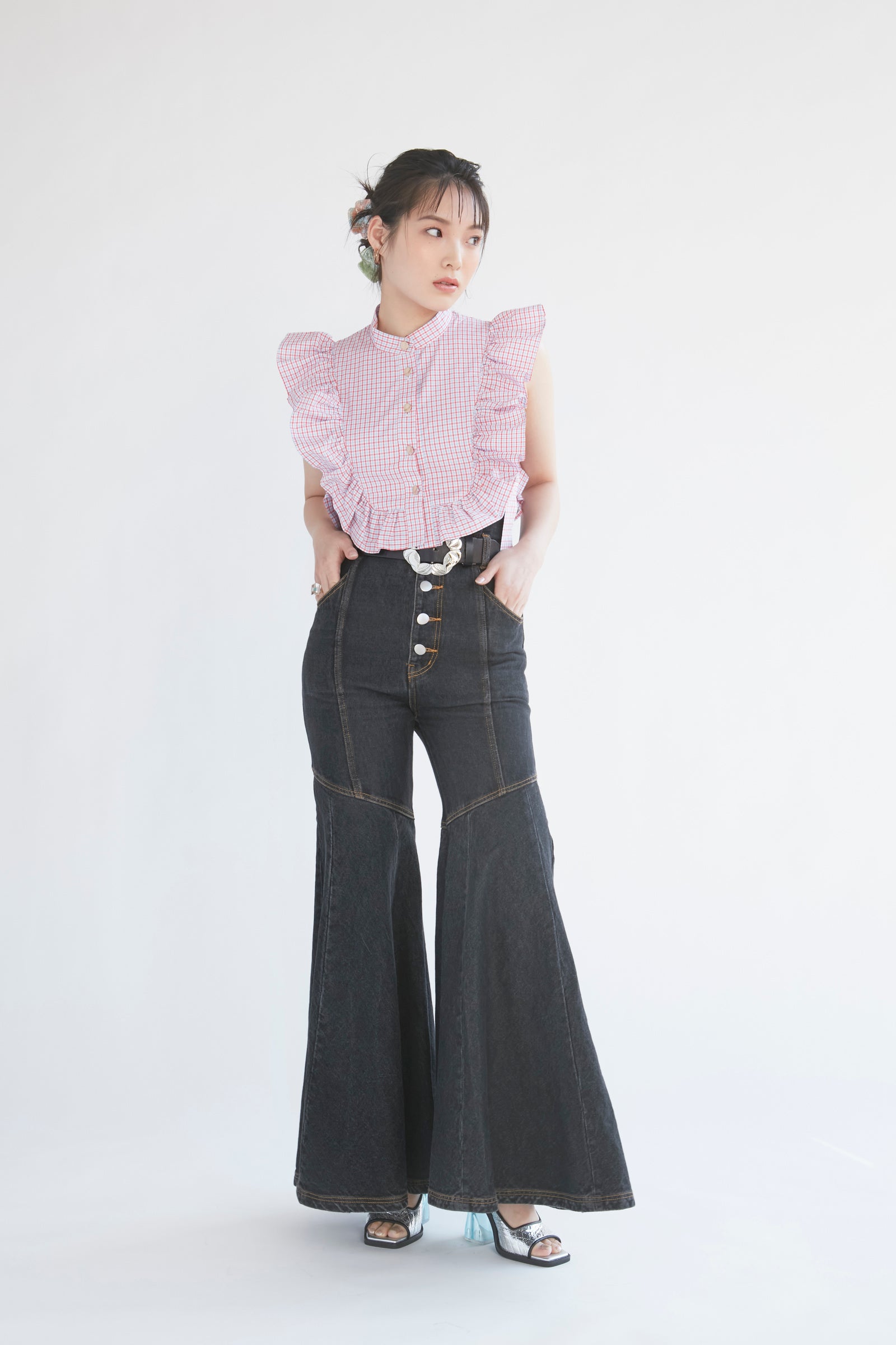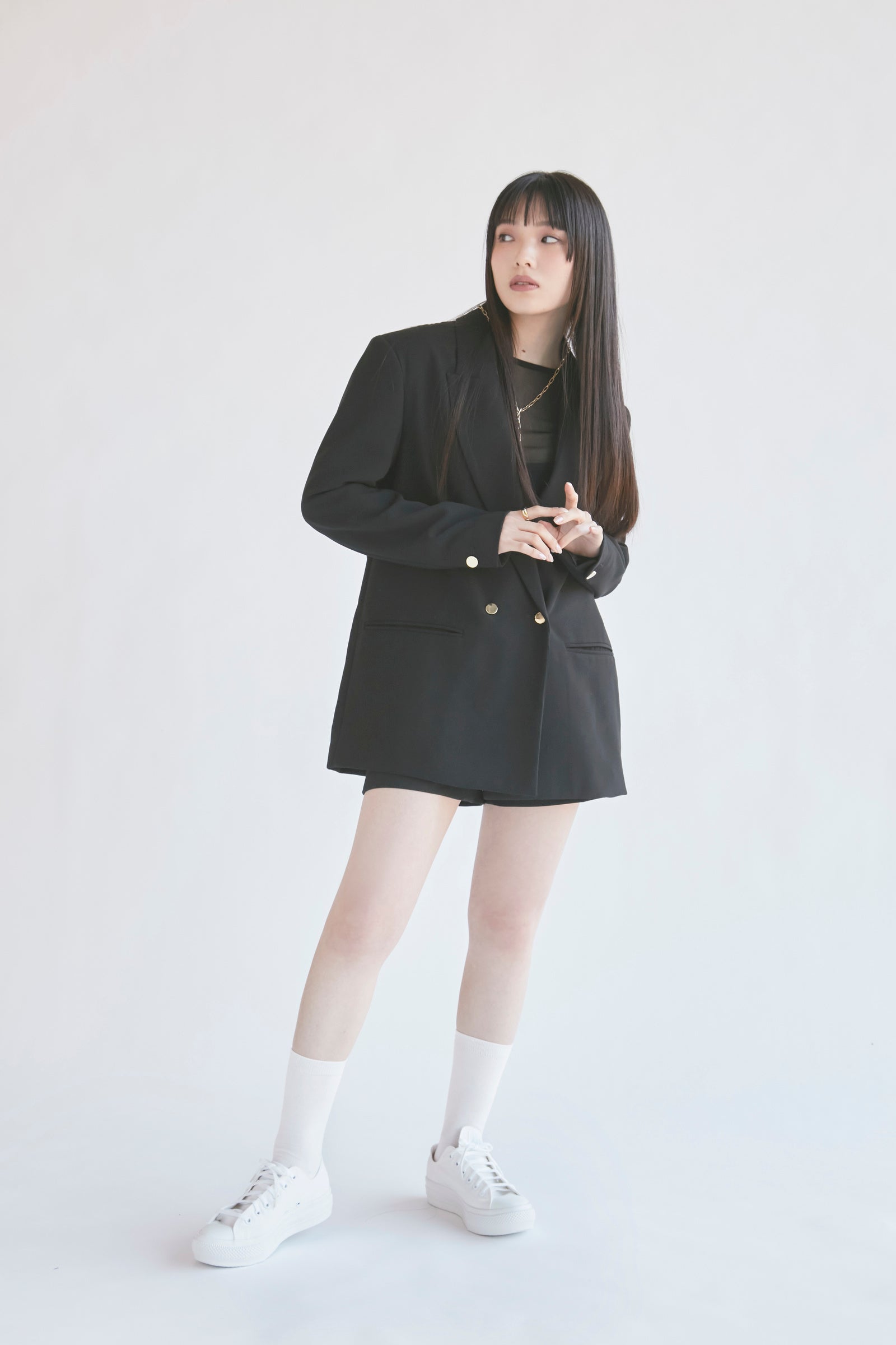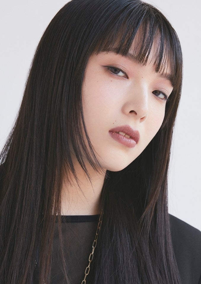 ヘアはワイドバング+顔周りにつくるセカンドバングで印象的に。前髪と顔周り以外の毛全体はアイロンでシンプルなストレートに仕上げます。
