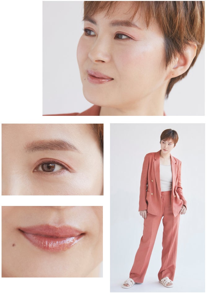 眉はチャコールグレーのナチュラルな仕上がりに。リップは指でポンポンとラフに塗り、大胆なフレッシュカラーにチャレンジ。