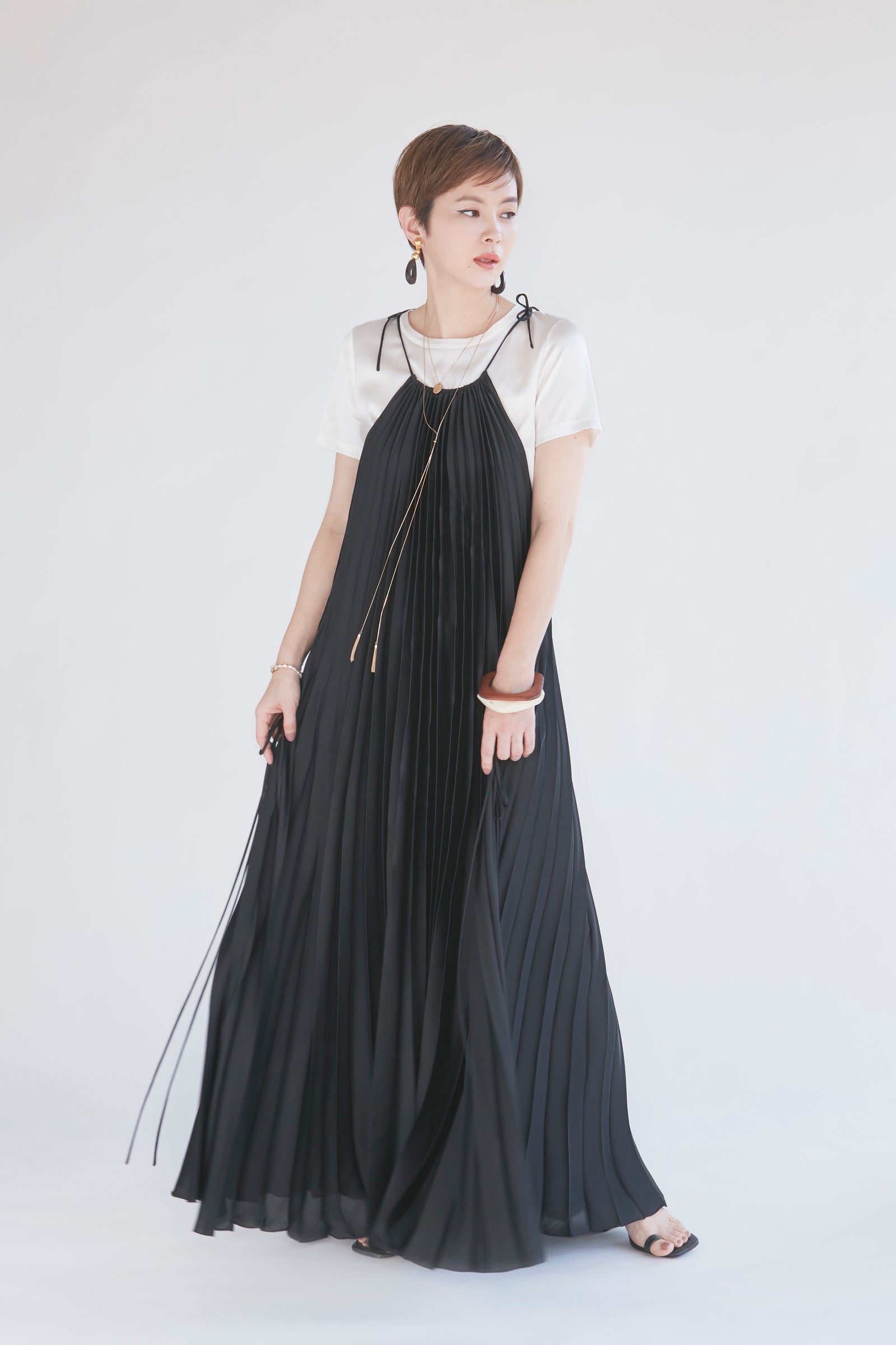 ヘアは注目の大きめクリップを使い、ざっくりまとめたアレンジで毛先に動きをつけます。