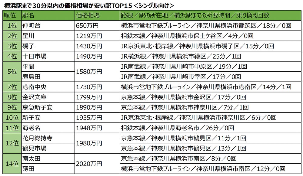 神奈川県屈指のターミナル駅横浜駅周辺では数年来の大規模再開発・整備事業がおこなわれています。そこで今回は注目が高まる横浜駅まで30分圏内にある駅の中古マンションの価格相場を調査。専有面積20平米以上~50平米未満の「シングル向け」と、専有面積50平米以上~80平米未満の「カップル・ファミリー向け」それぞれの、価格相場が安い駅トップ15を発表します。