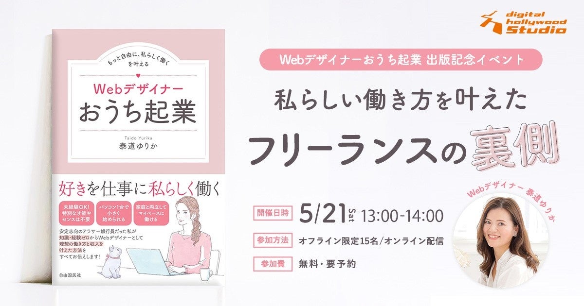 IT関連及びデジタルコンテンツの人材育成スクール、デジタルハリウッド(運営会社:デジタルハリウッド株式会社 本社/本校:東京都千代田区 学長:杉山知之)が運営をする、新しい学びのスタイルを通して多様なライフスタイルを支援し全国へ展開している、Webと動画について学べるラーニングスタジオ『デジタルハリウッドSTUDIO』では、卒業生・泰道ゆりかさんの著書『Webデザイナーおうち起業』の出版を記念し、オフライン・オンラインのハイブリッド形式のイベントを開催いたします。全国から参加が可能です。