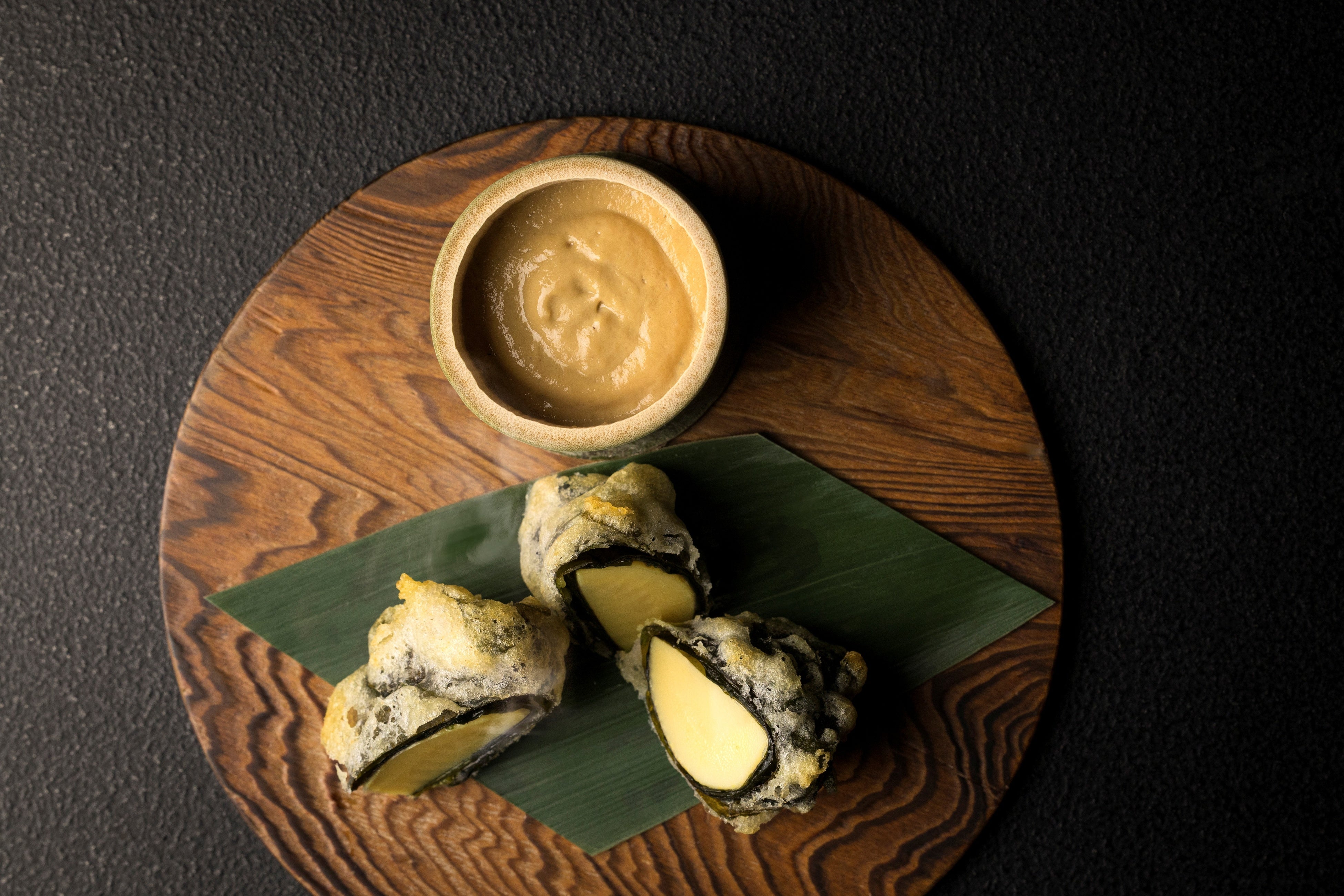 鶏肉や野菜を青竹に入れて火にくべ、竹の香りとともに楽しむ宮崎の郷土料理「かっぽ鶏」を、春の食材でアレンジしました。出汁で炊いた筍にワカメを巻き、軽やかな食感のベニエ(*1)に仕上げました。鶏出汁やレバーペーストの旨みを凝縮し、ヴァンジョーヌ(*2)を香らせた芳醇なソースに絡め、味わいの変化も楽しめます。春の出合いの「若竹」に、和洋が融合する奥行きを重ねた一皿です。