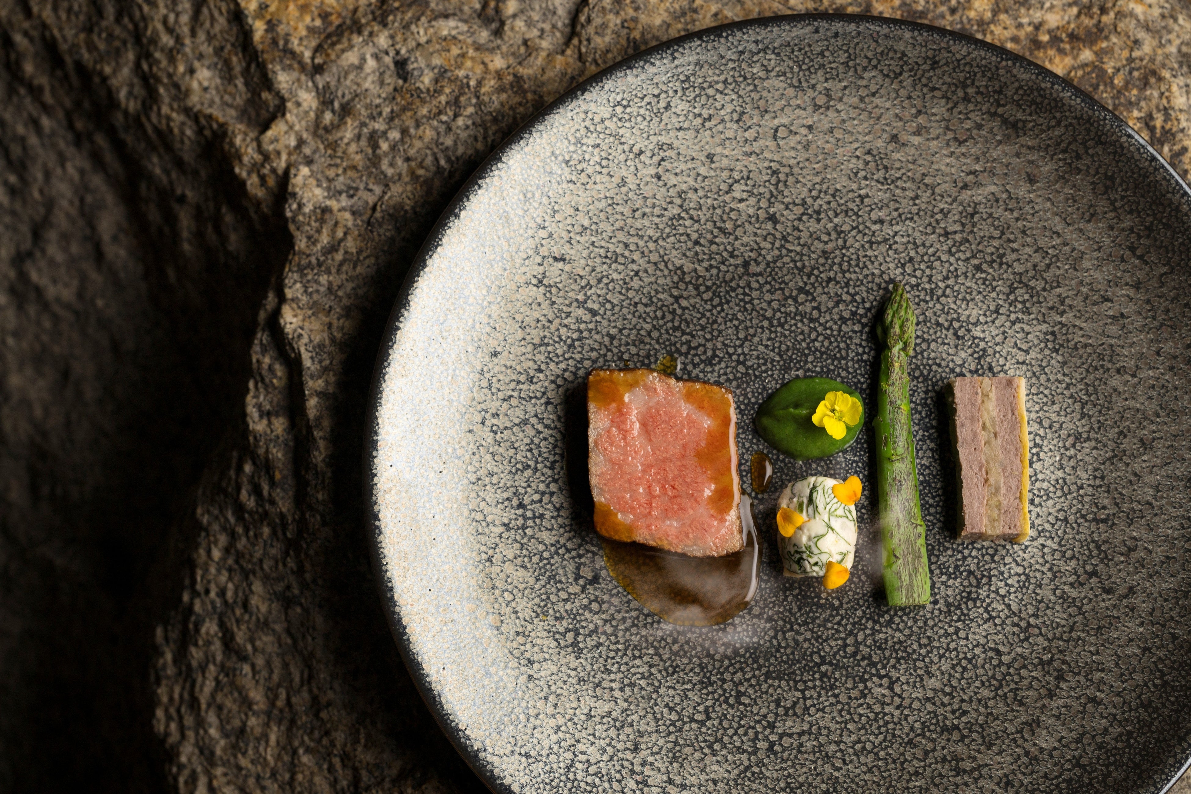 メインの肉料理には、アスパラガスとともに、滋賀の郷土料理にちなんだ付け合わせを添えています。団子を白和えで包んだ「おあえ団子」は、もちもちとしたニョッキに豆腐とクレソンの合わせバターをのせて食感と味わいを再現しました。「鮒ずし」の飯(*3)に漬け込んだ牛ミンチで仕立てる付け合わせは、鮒ずしならではの酸味と旨味を感じ、伝統の食文化と独創的な発想が融合した一皿です。