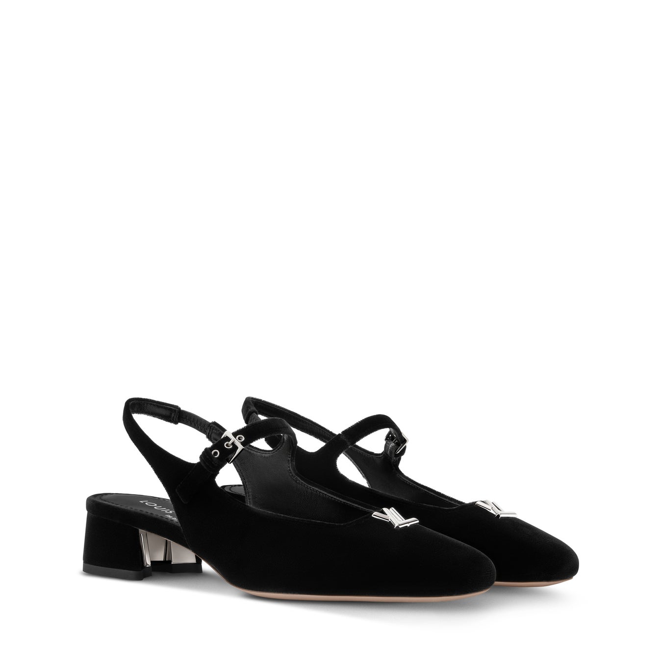 なめらかなベルベットが控えめなヴィンテージ風のルックを引き立てる「スウィング メリージェーン パンプス」。アッパーを彩るLV ツイストのアクセサリーと、細身のストラップに配したシャープなスクエアバックルには、シルバーカラーのメタルを使用しました。メゾンならではの「V」シェイプのカットアウトを施した低めのブロックヒールが、メタリックな内側を際立たせます。