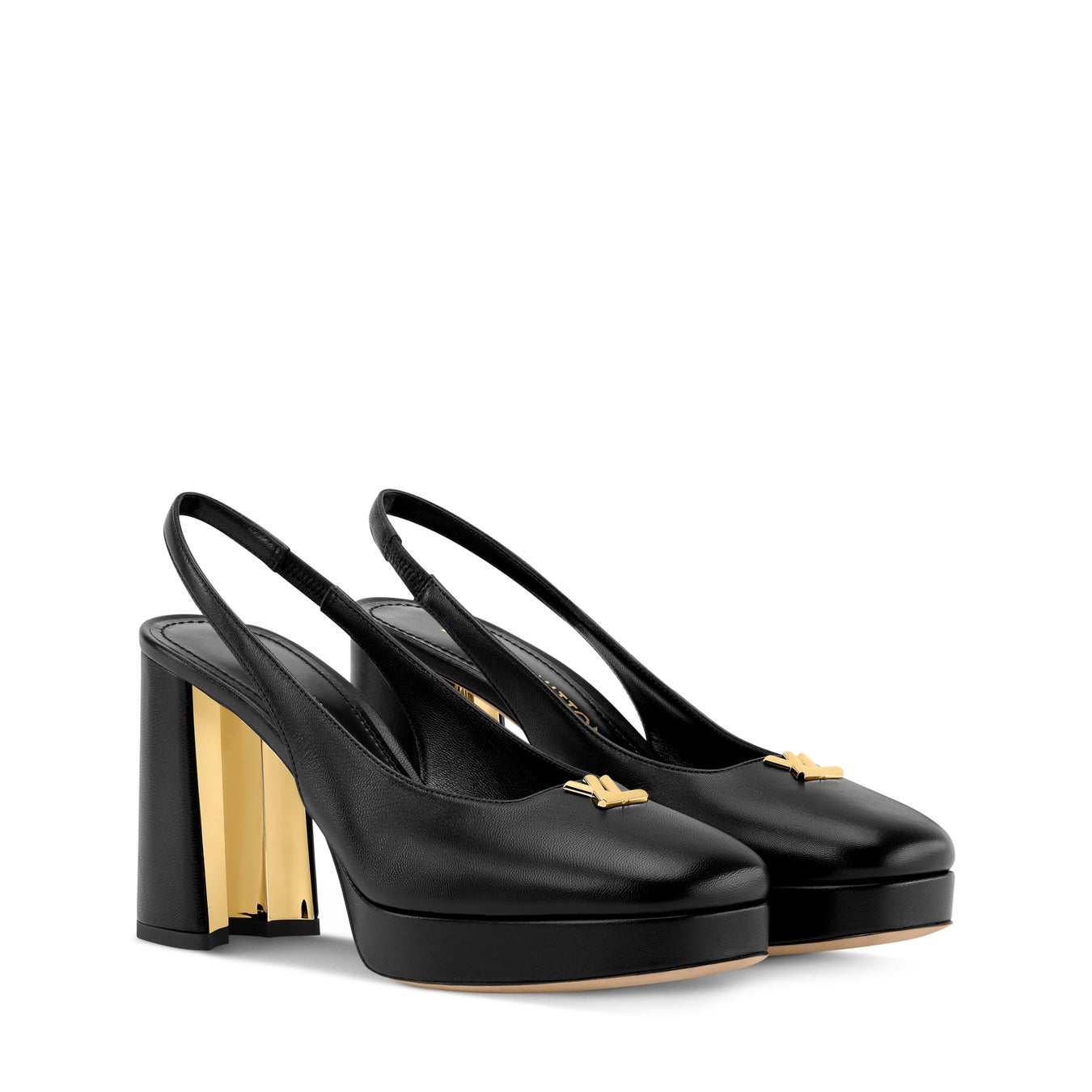 しなやかなゴートスキンを使用したシックなスタイルの「スウィング パンプス」。アッパーには、LV ツイストのアクセサリーと細身のストラップに端正なスクエアバックルを、いずれもシルバーカラーのメタルであしらいました。メタリックな内側が、低めのブロックヒールに施された特徴的な「V」シェイプのカットアウトを際立たせます。