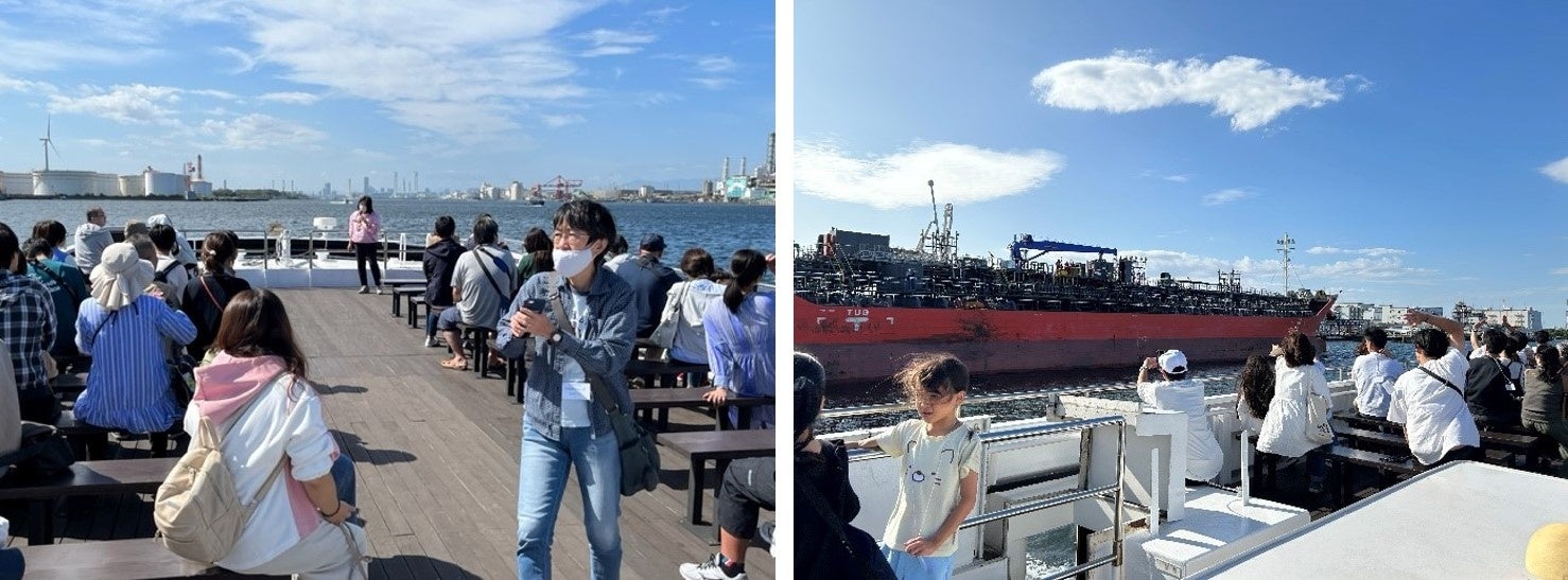 海外との貿易の窓口にもなっている川崎港。普段入ることのできないコンテナターミナルを海から眺めたり、川崎港の産業を支える工場地帯を周遊。屋外のデッキではガイドが付いて地域や施設の紹介を行いました。