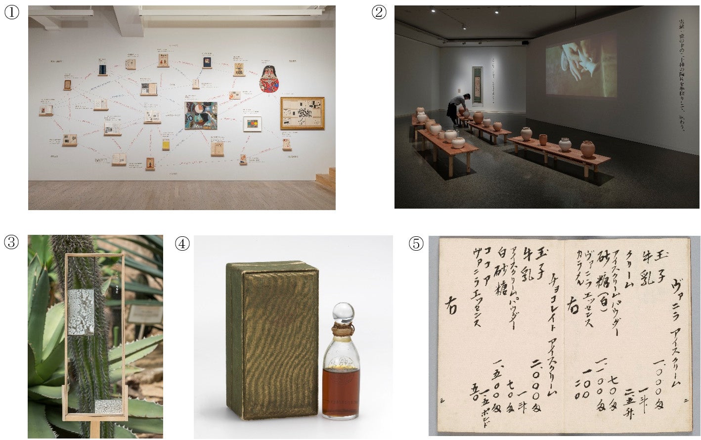 資生堂ギャラリーの「万物資生|中村裕太は、資生堂と を調合する」では、文献調査やフィールドワークをもとに作品を発表してきた美術家・中村裕太とともに、企業資料を用いながら「万物資生」の思想を紐解いていきます。中村は、「万物資生」という言葉を、「目に見えないつかまへられないものが天から来て、地上の物質がそれを受取つて生物を生ずる」と解した文献(飯島忠夫『易経研究』信濃教育会、1932年)に着目し、「調合」という方法を導き出しました。大展示室では、創業時から1940年代初頭までの化粧品や広告と、資生堂にまつわる人物のうち岸田劉生、富本憲吉、今和次郎らの活動を調合し、この時代と資生堂との関わりを、中村の造形とともに相関していきます。また、小展示室では、化粧品の原料となる椿種子の残材を釉薬として調合した中村の作品を展示し、会期中には、トークイベント等を行いながらアートとサイエンスやサステナビリティについての考えを深める場とする予定です。このような「調合」を作品制作の方法として取り入れることで、複層的に「万物資生」という思想を浮かび上がらせていきます。