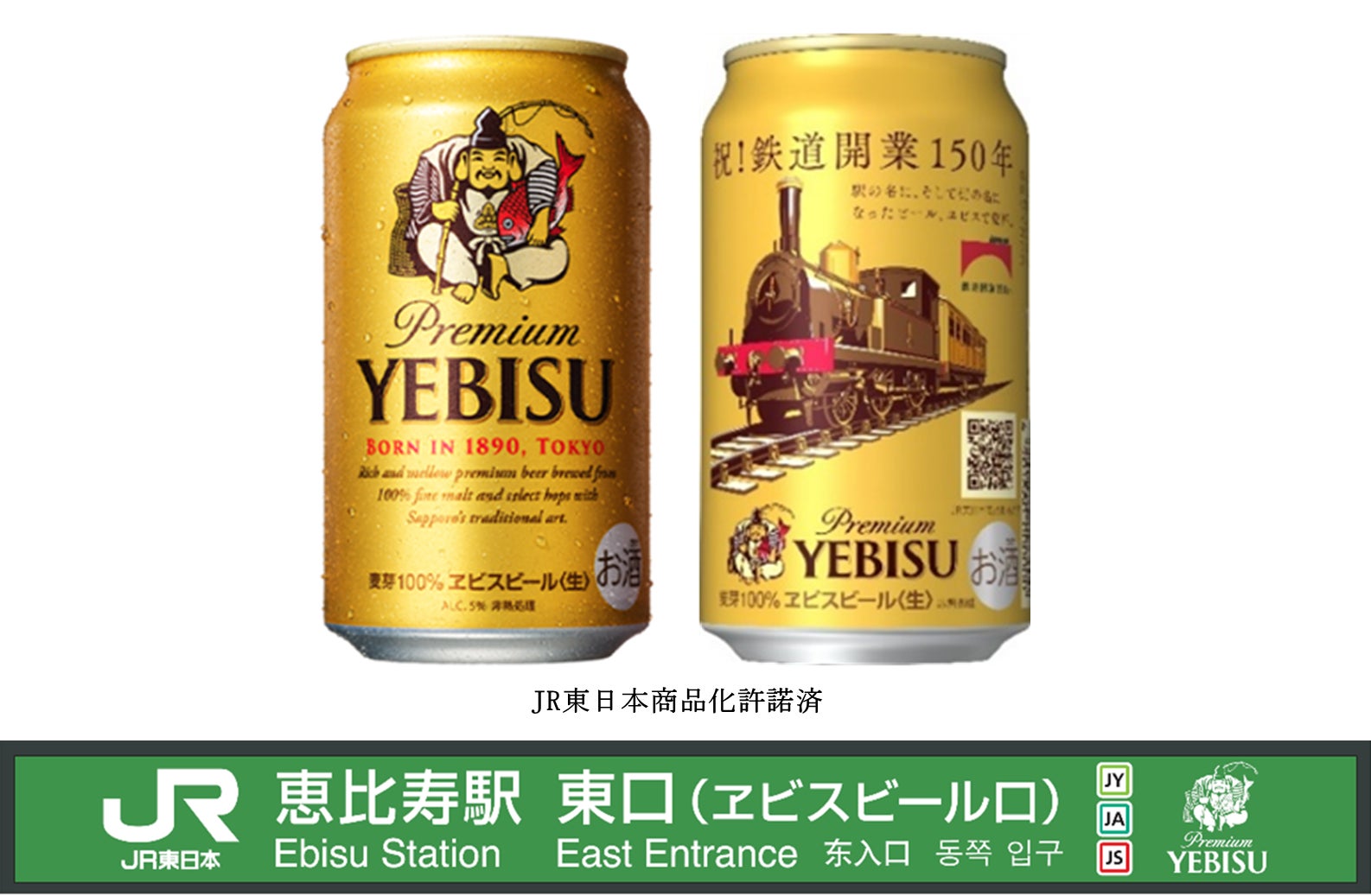 ヱビスビール「鉄道開業150年記念」缶数量限定発売。JR恵比寿駅東口に「ヱビスビール口」の愛称も期間限定で追加。